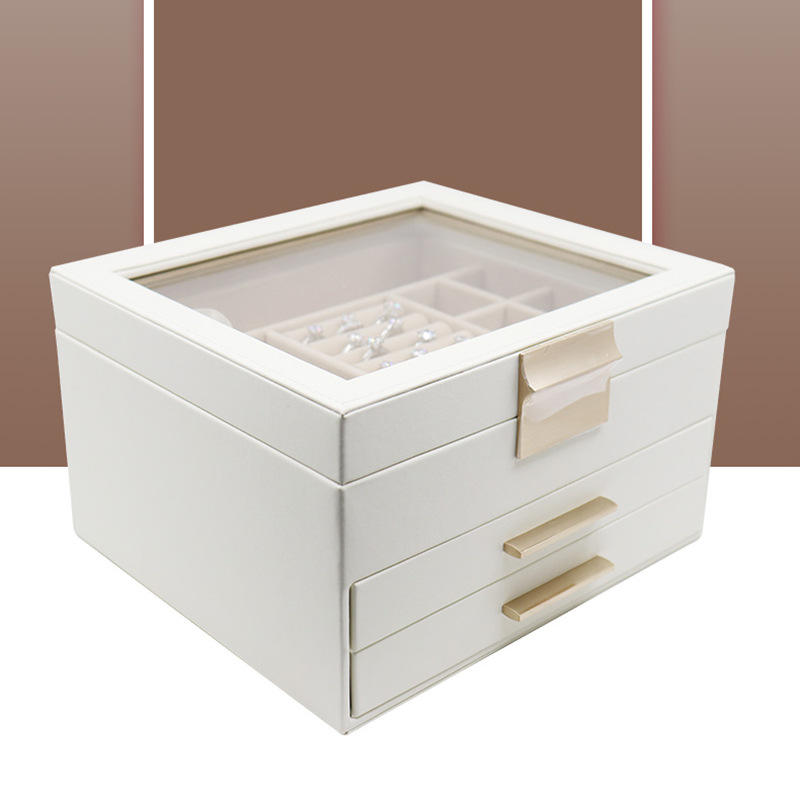 Organisateur de bijoux en cuir PU blanc à 3 niveaux avec couvercle en verre pour ranger les boucles d'oreilles, les colliers, les bracelets et les bagues