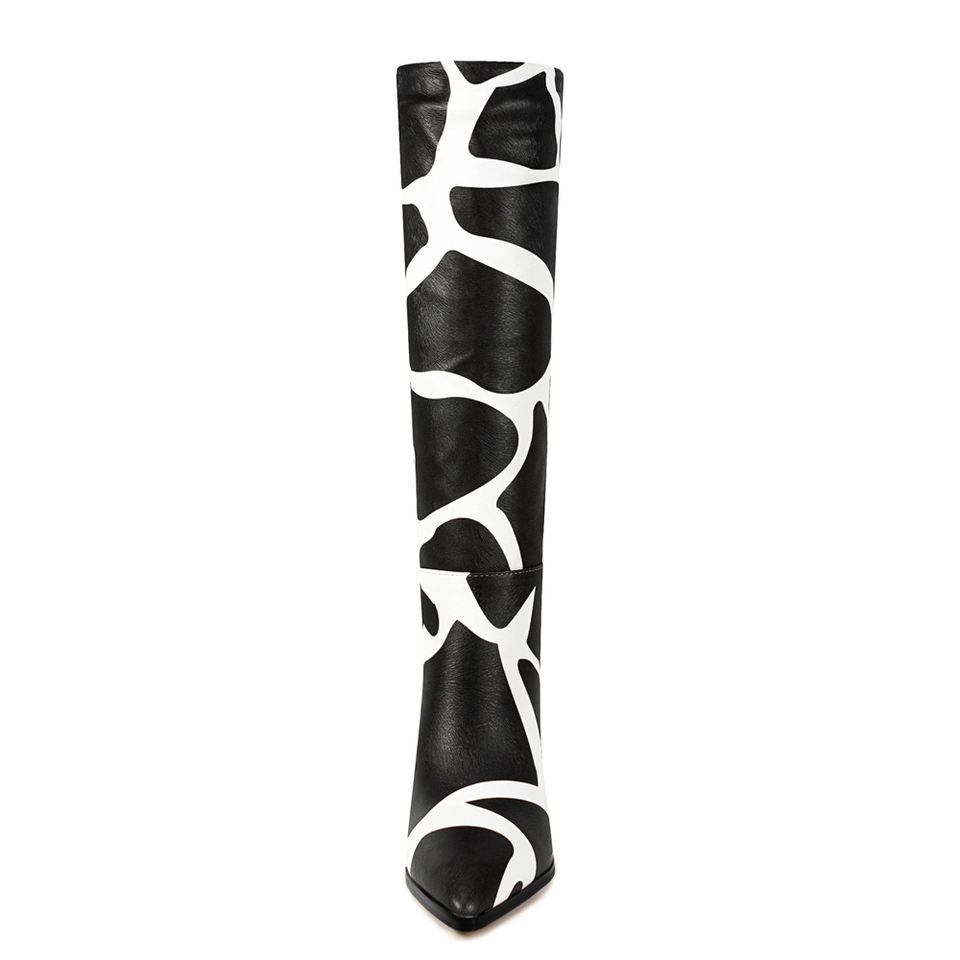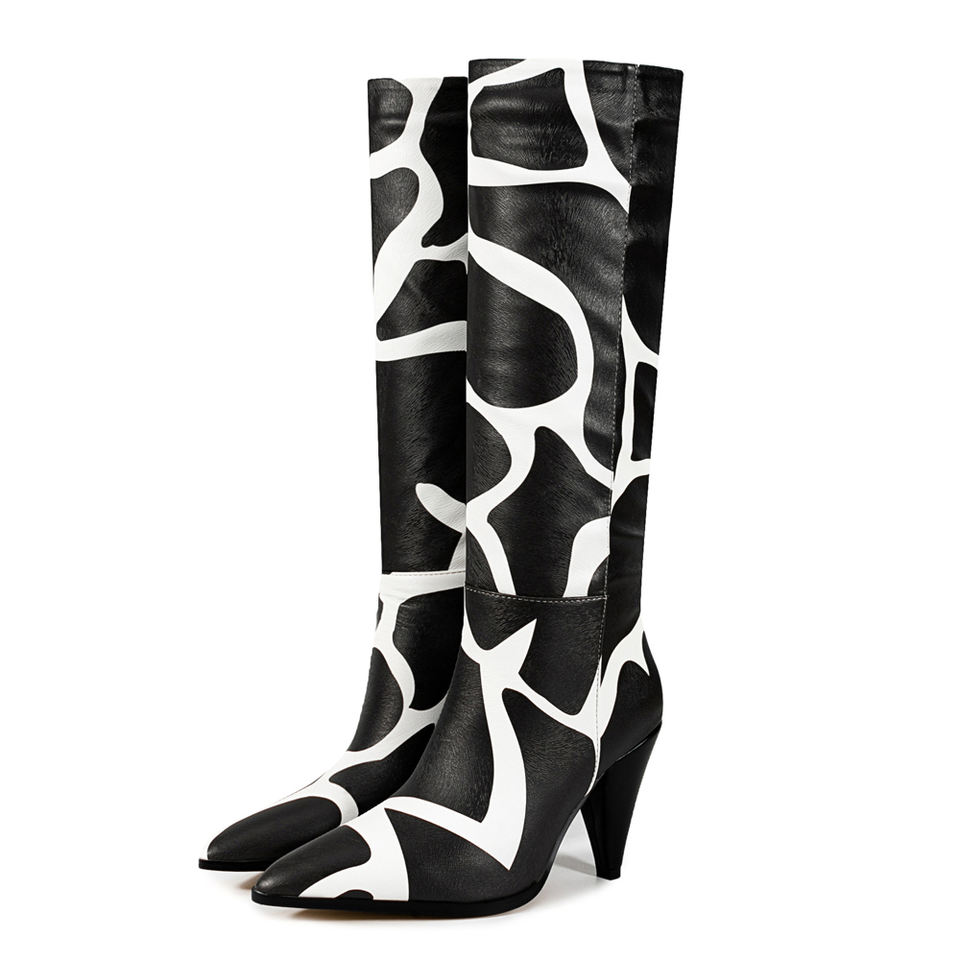 Bottes hautes pour femmes à motif blanc, coupe large, talons hauts à pointe, style bottines longues