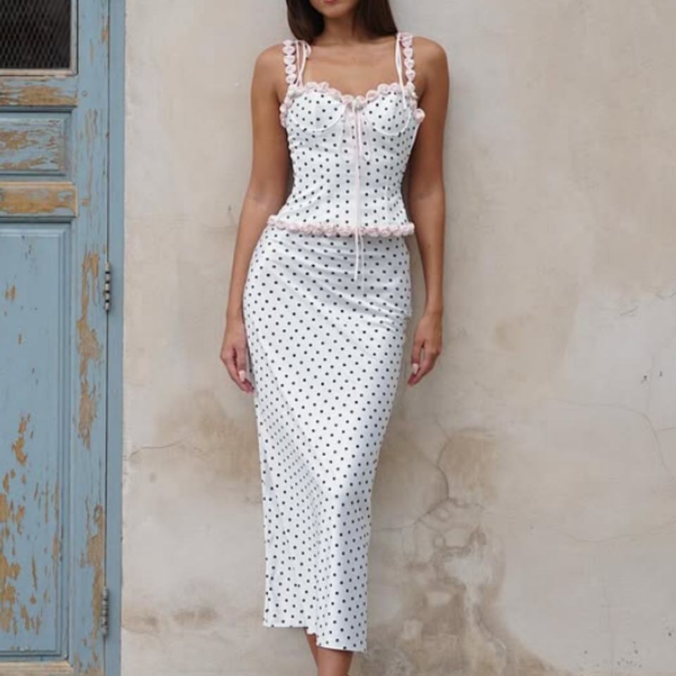 Ensemble deux pièces blanc à pois pour femme, haut corset à bretelles spaghetti et jupe midi avec bordure à volants rose