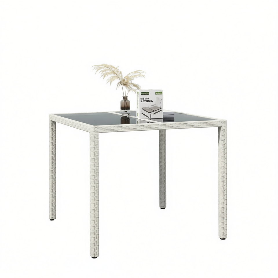Table de jardin en polyrotin blanc 35,4 x 35,4 x 29,5 pouces avec plateau en verre trempé, mobilier d'extérieur
