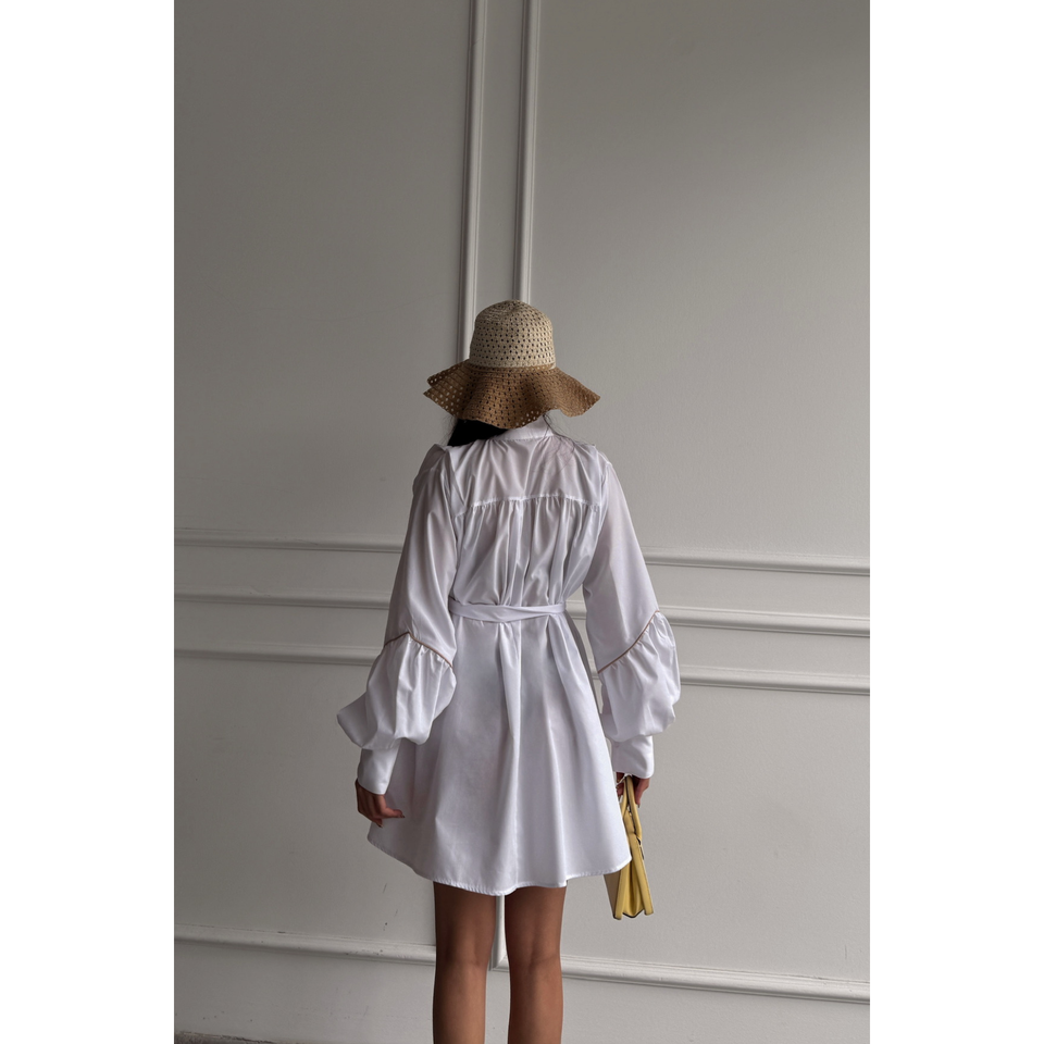 Robe de soirée évasée en popeline blanche avec détail boutonné sur le devant et ceinture à nouer