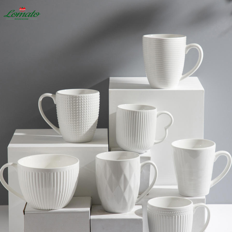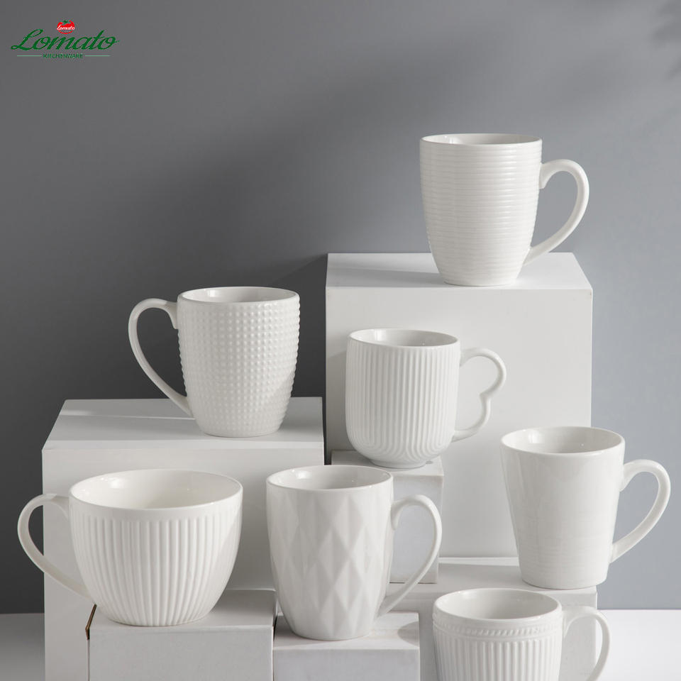 Tasses à café en porcelaine blanche avec logo personnalisé, vente en gros, écologiques, durables, design moderne en relief | En stock