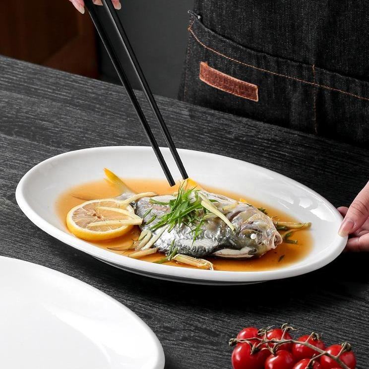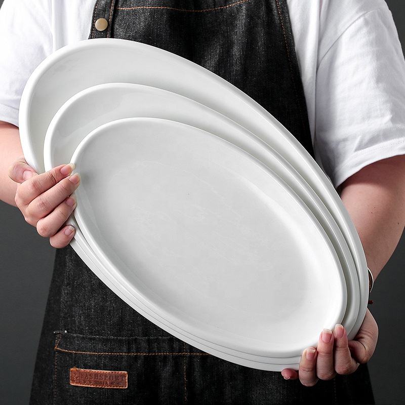 Plat à poisson ovale en porcelaine blanche à bord épais, grand plat, passe au micro-ondes, passe au lave-vaisselle, plat à poisson pour la maison, le restaurant, l'hôtel