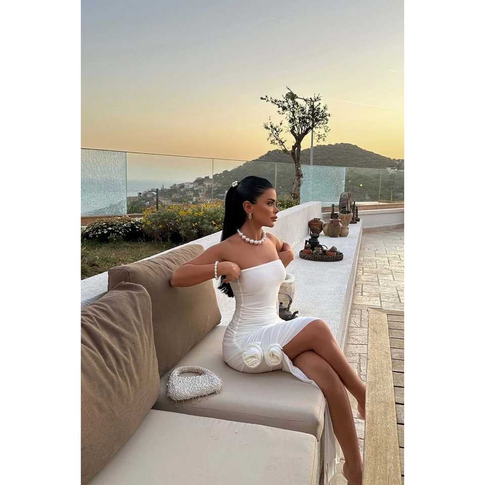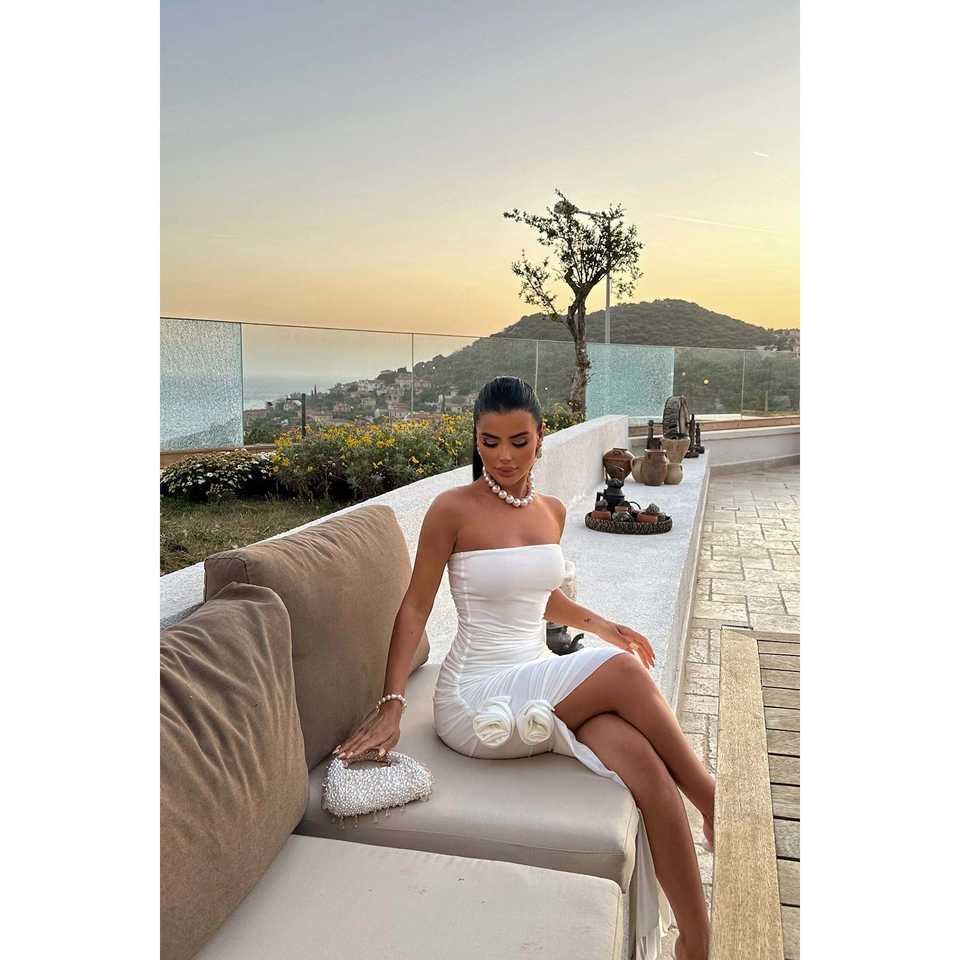 Robe de soirée blanche en crochet avec détails roses, col rond, silhouette de robe de bal, longueur au sol, robe de bal à sequins