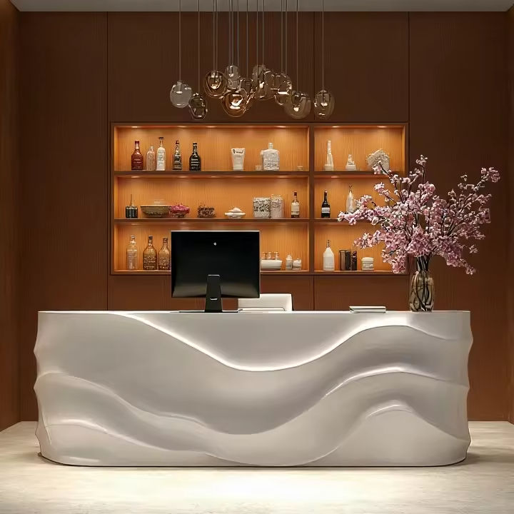 Comptoir d'accueil blanc au design moderne avec base LED bleue et façade unique en forme de coquille