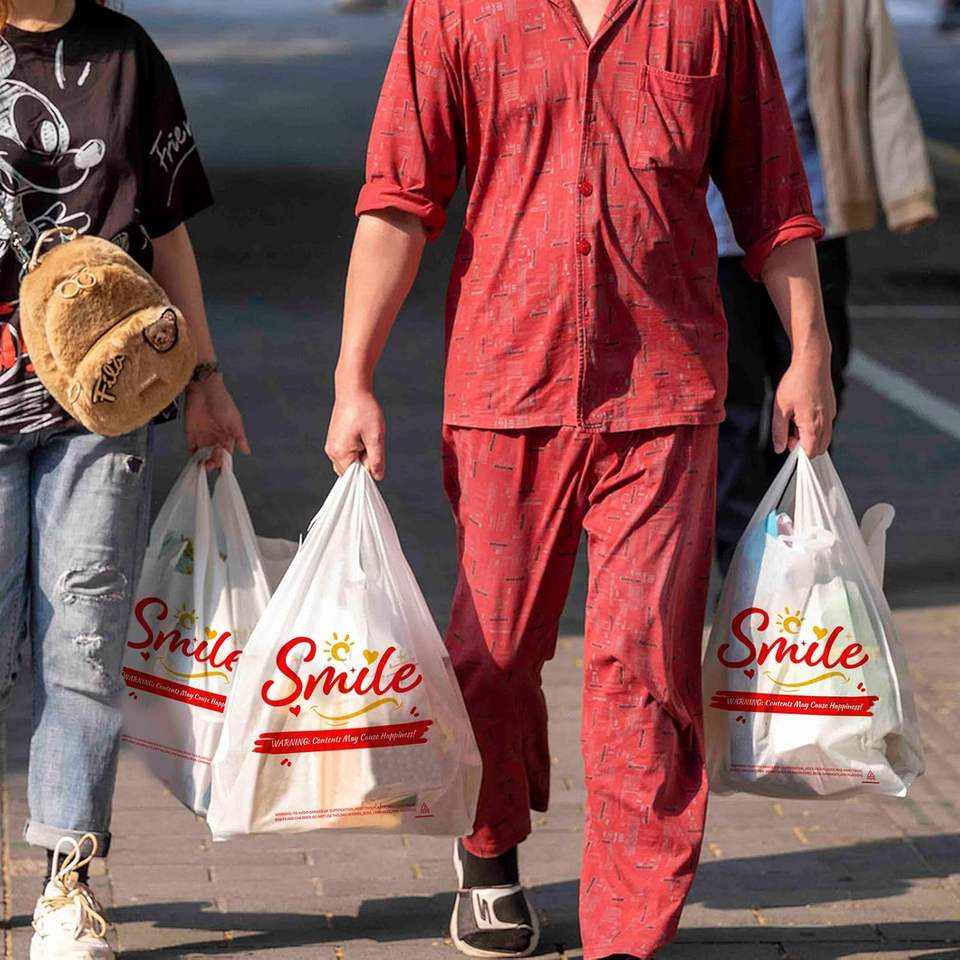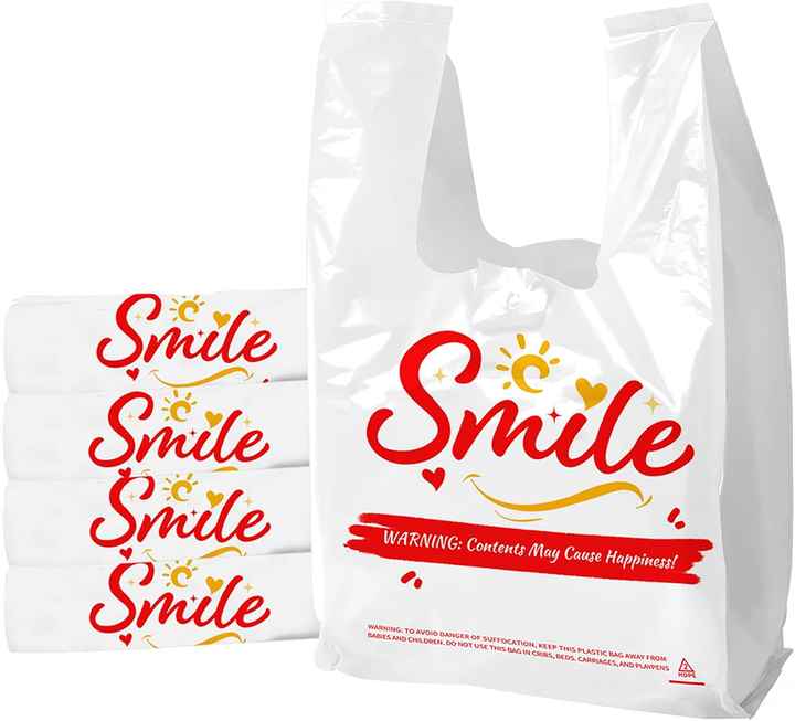 Sacs de courses en plastique PE biodégradable White Smile avec poignées, personnalisation par marquage à chaud pour la vente en gros et les petites entreprises