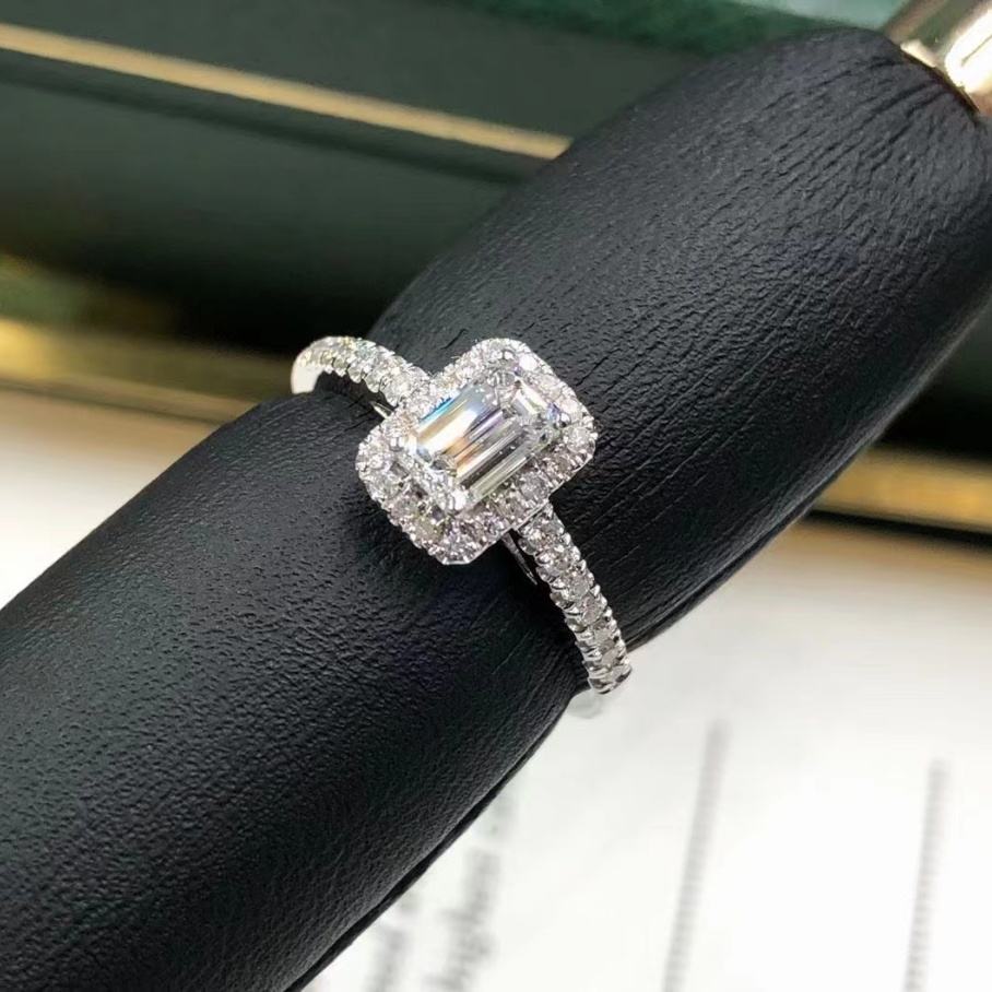 Nom:Bague de mariage halo en moissanite taille émeraude blanche 14 carats, bijoux de fiançailles.