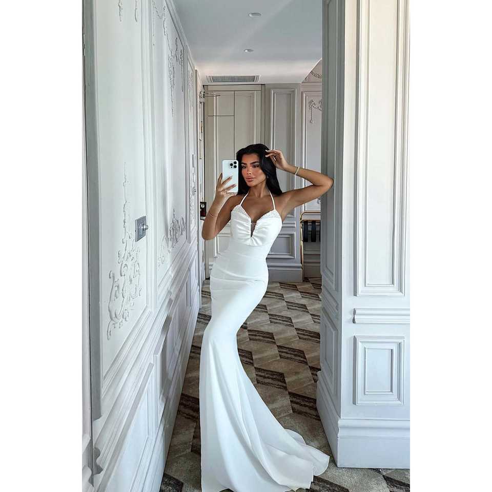 Robe de bal blanche à détails pierres, fente et bretelles, col rond, taille empire, à franges, en polyester, pour soirée formelle, disponible du XS au XL, pour mariage