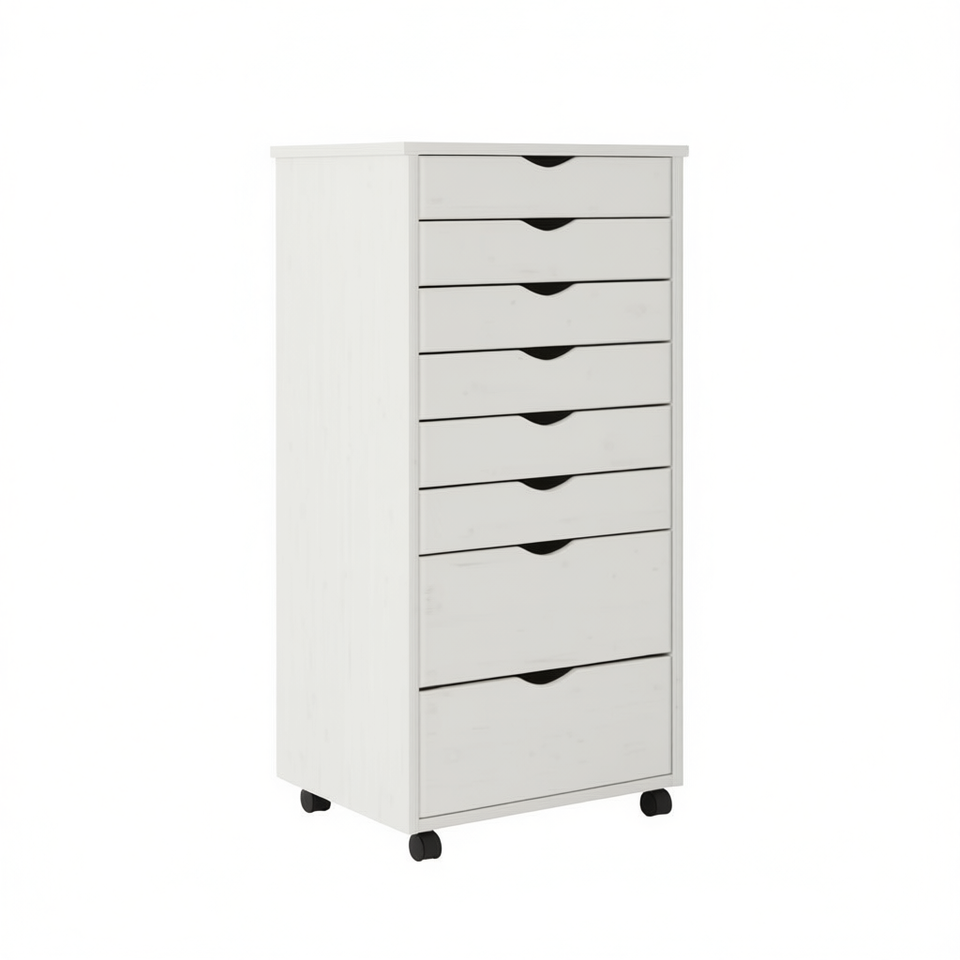 Chariot de rangement blanc avec tiroirs, sur roulettes, design minimaliste, organisateur pour salon, cinq niveaux et plus