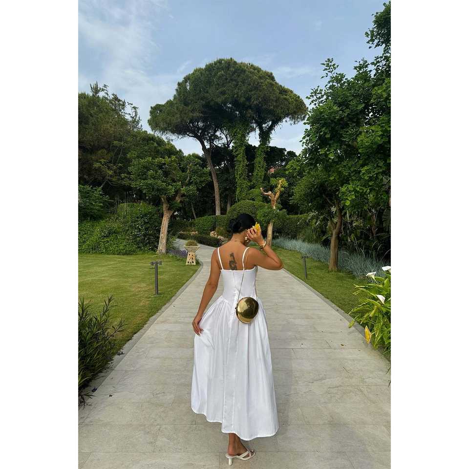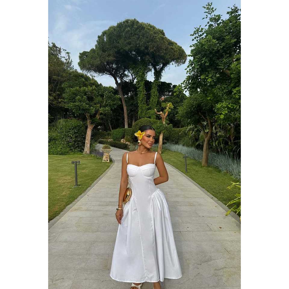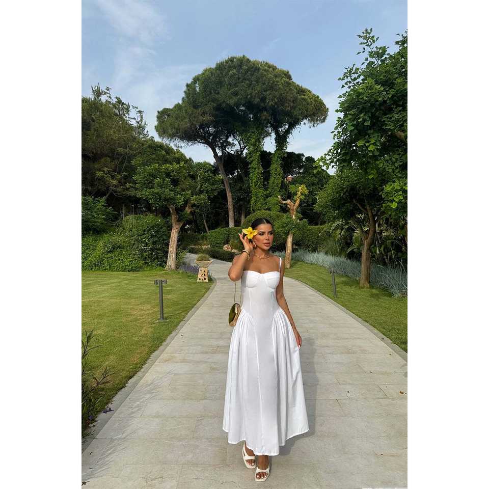 White Strappy Floral Long Dress Zipper Ruffle Decor Formal Party Style One Size/XS for Women/Ladies Spaghetti Strap Floor-Length