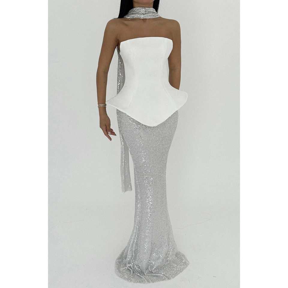 White Viona Ball Gown Evening Dress Set Formal Party Wedding Guest Skirt Top with Short Sleeves Rhinestone Decoration XL Size