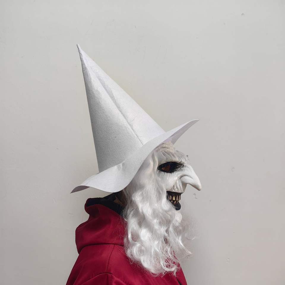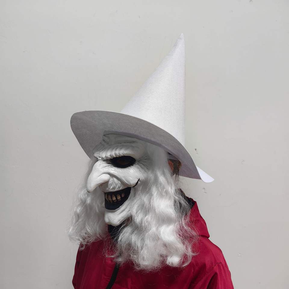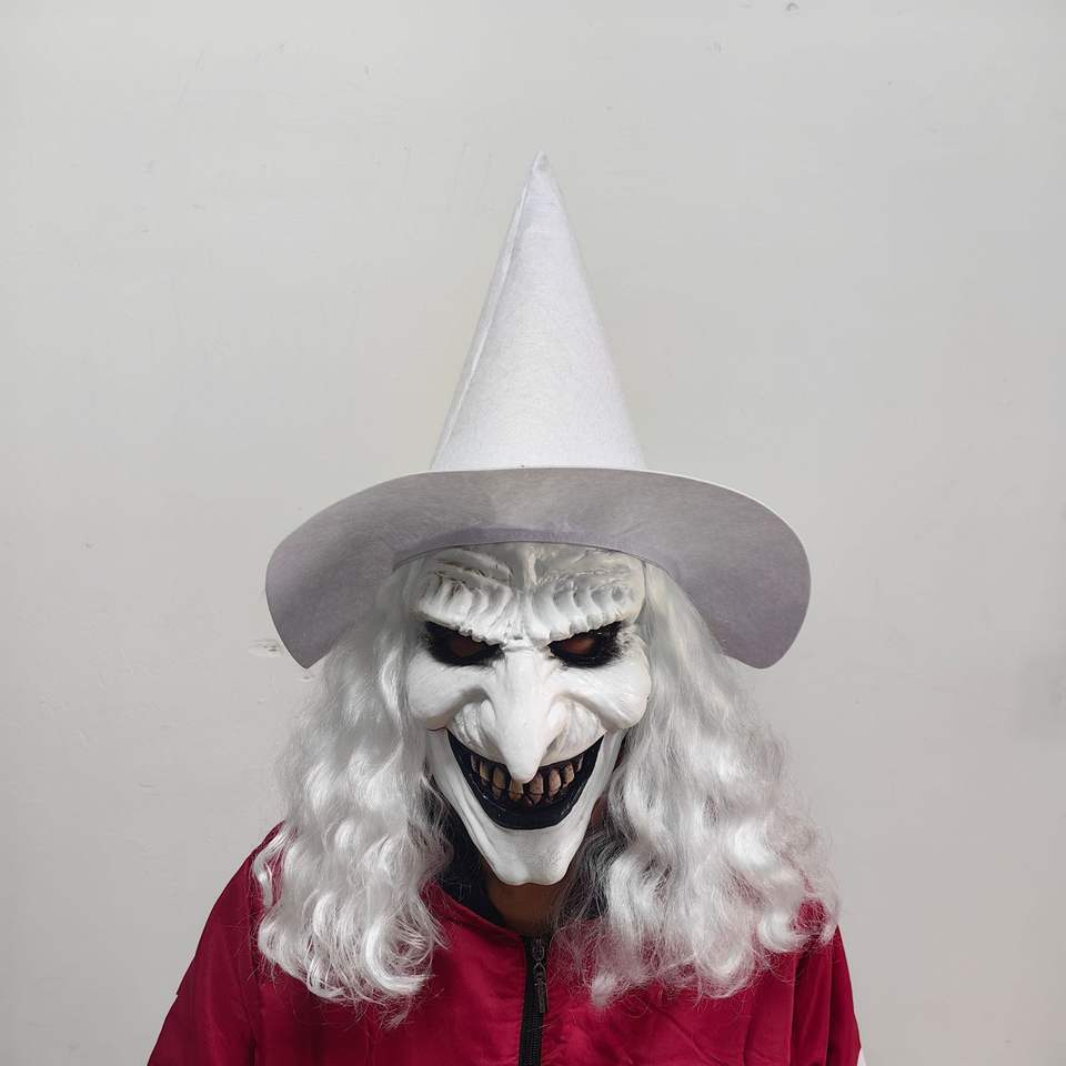 Masque de sorcière blanche avec cheveux longs, chapeau à capuche en latex, accessoires de costume d'Halloween
