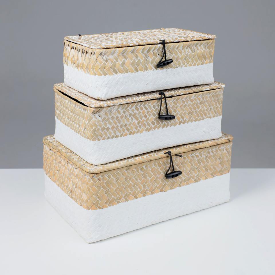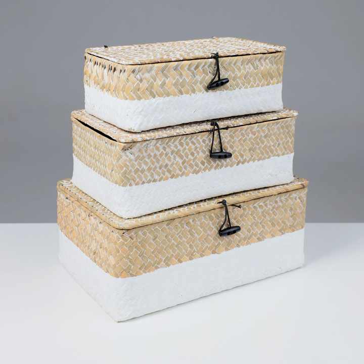 Boîte blanche en paille de jonc de mer, panier de rangement naturel, boîtes à couvercle en jonc de mer