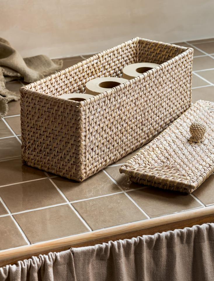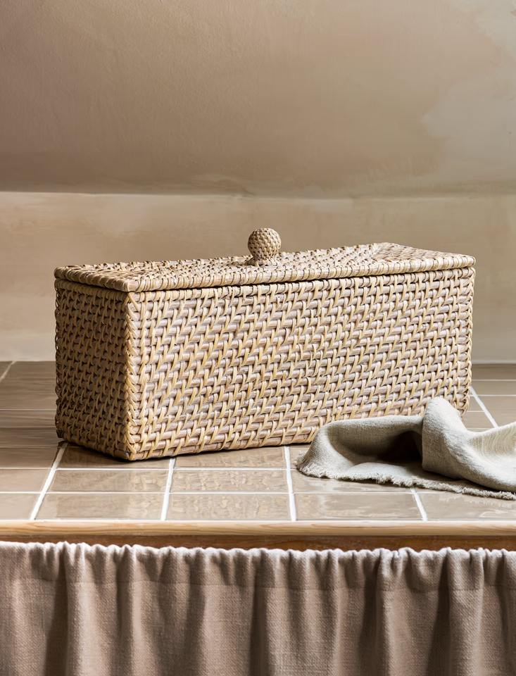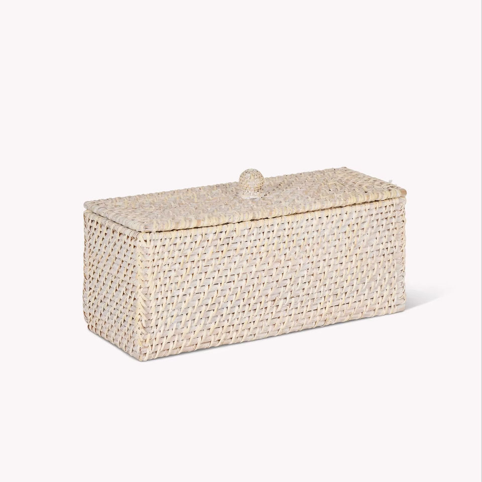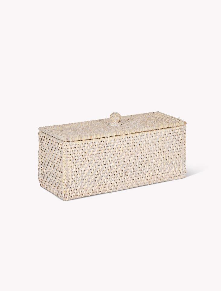 Nom:Boîte de rangement rectangulaire en rotin blanc. Dimensions : L15 x L5,5 x H5,5 pouces.
