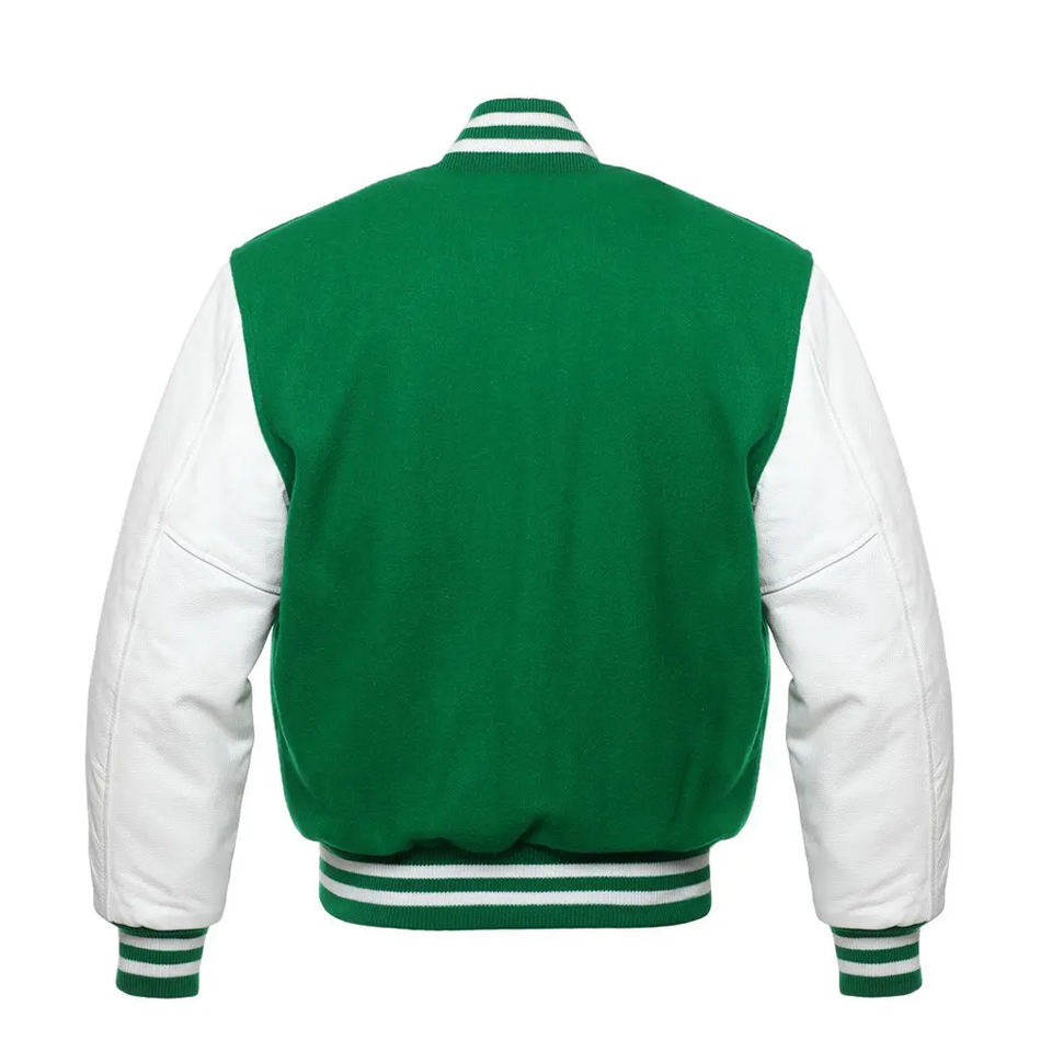 White sleeves-kelly green-body varsity bomber jacket Letterman Jacket with Leather Sleeves leather varsity jacket