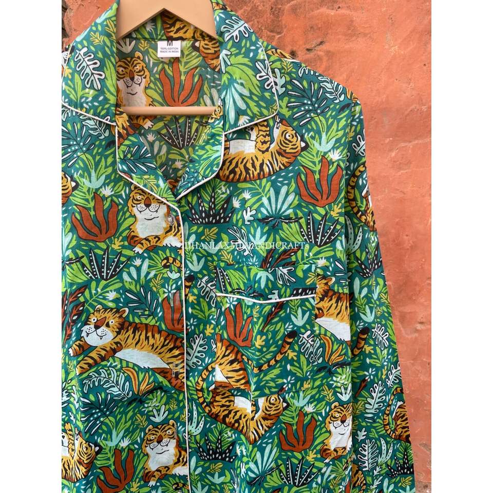 Vente en gros 100% ensemble de pyjama en coton biologique vêtements de nuit indiens à imprimé tigre vert chemise en coton sexy pantalon avec combinaison de nuit