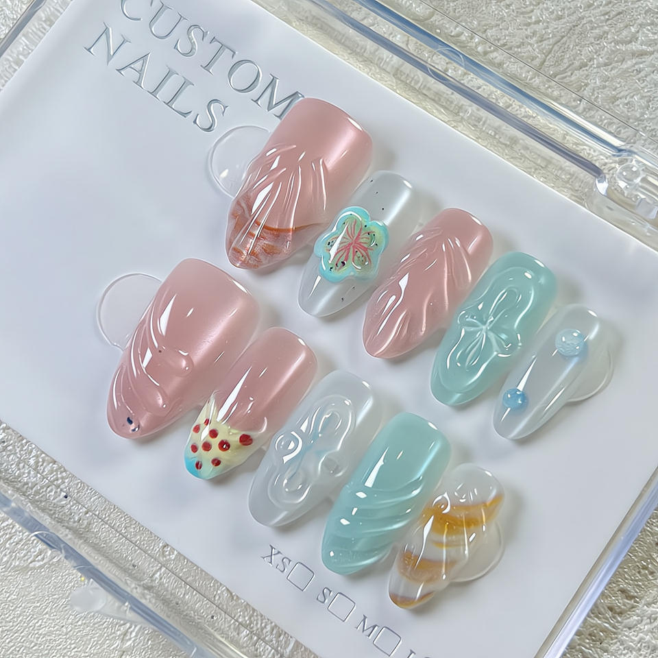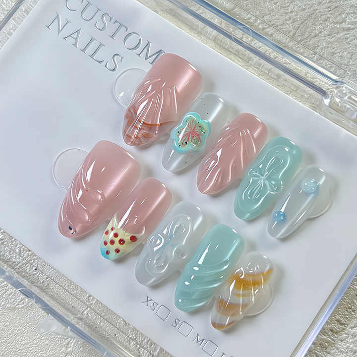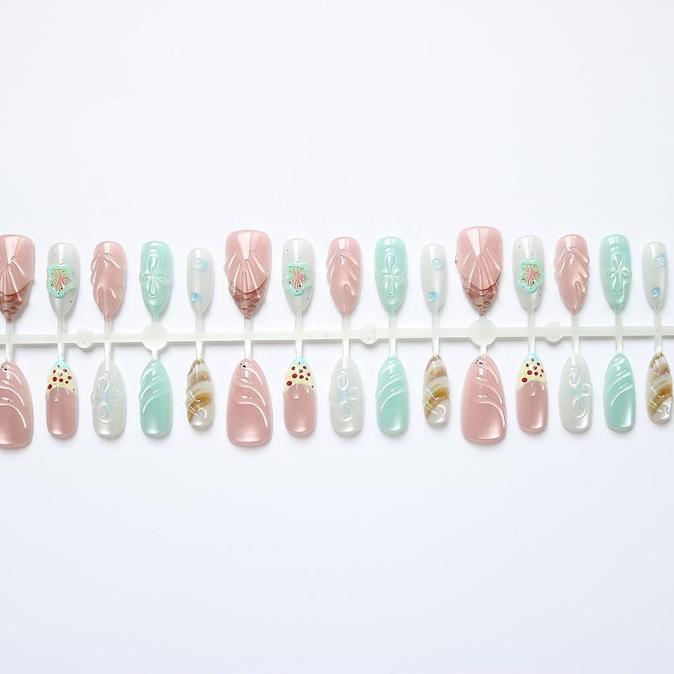 En gros 10Pcs Réutilisable Court Amande Faux Ongles 3D Shell Motif Yeux De Chat Presse sur Ongles pour L'été
