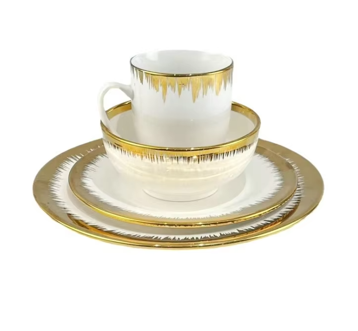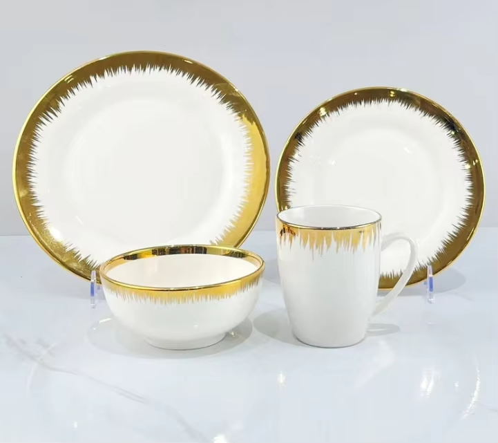 Lot de 16 pièces de vaisselle en céramique avec bordure dorée, service pour 4 personnes, prix de gros, fabricant de services de vaisselle