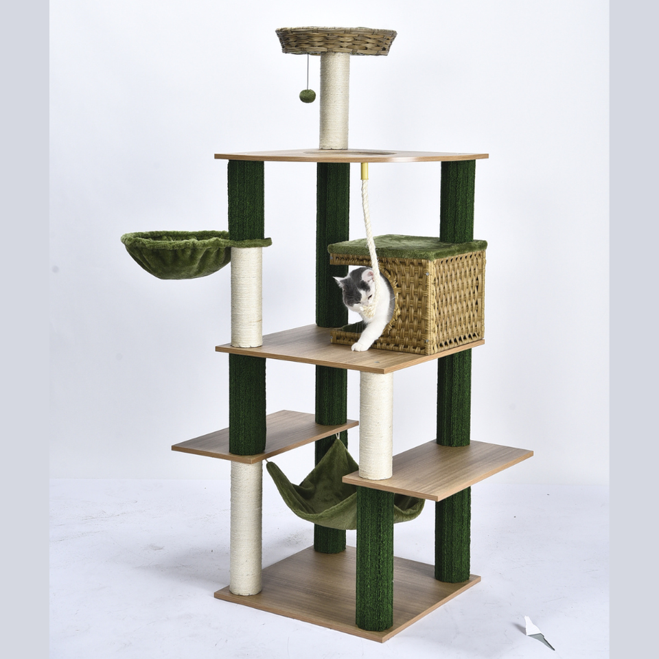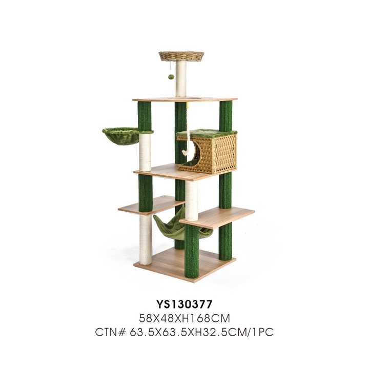 En gros Arbre à chat 168 cm multi-niveaux en bois avec niche en osier, poteaux à gratter en sisal et hamac en peluche OEM ODM