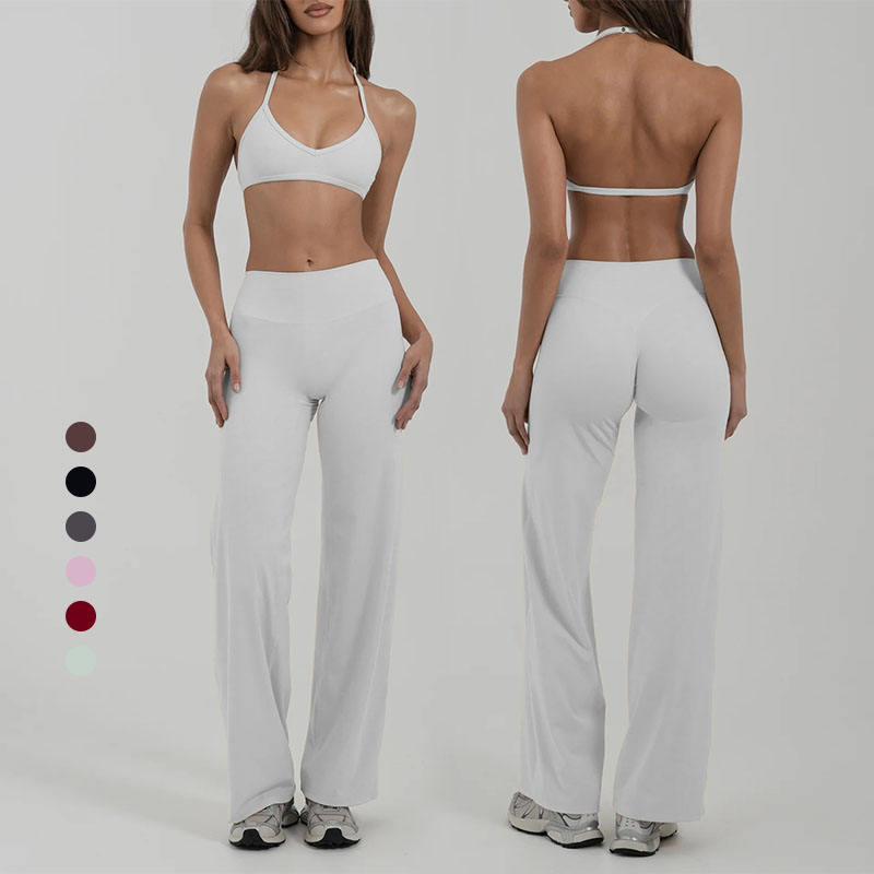 Lot de 2 pièces de vêtements de sport et de yoga à col halter en V profond, pantalon évasé taille haute, séchage rapide