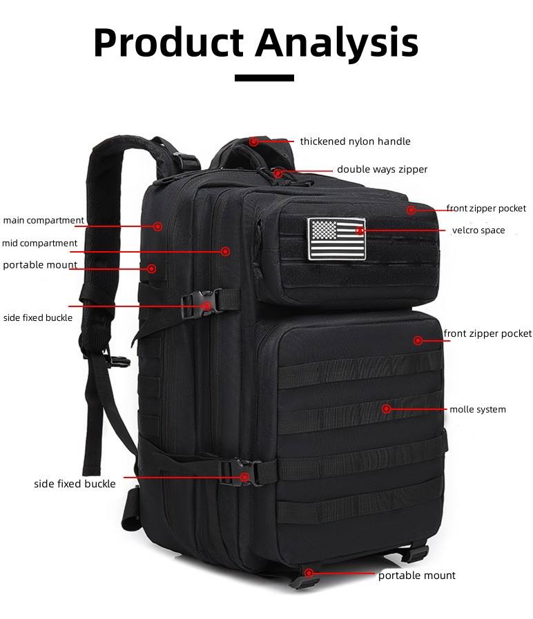 Vente en gros Sac à dos tactique 45L Sac à dos tactique Molle avec logo personnalisé Sac à dos tactique avec doublure Oxford à motif camouflage pour les voyages