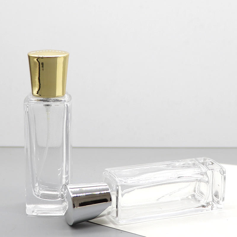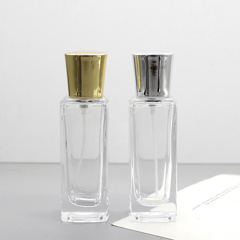 Vente en gros de flacons de parfum en verre transparent carrés de 50 ml, blanc cristal, rechargeables, vides, avec bouchons à clipser