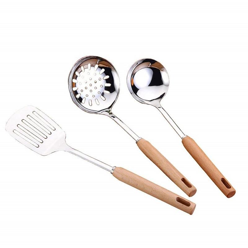 Ensemble d'ustensiles de cuisine en acier inoxydable 304, 6 pièces, spatule, cuillère, manche en bois, ustensiles de cuisine en gros