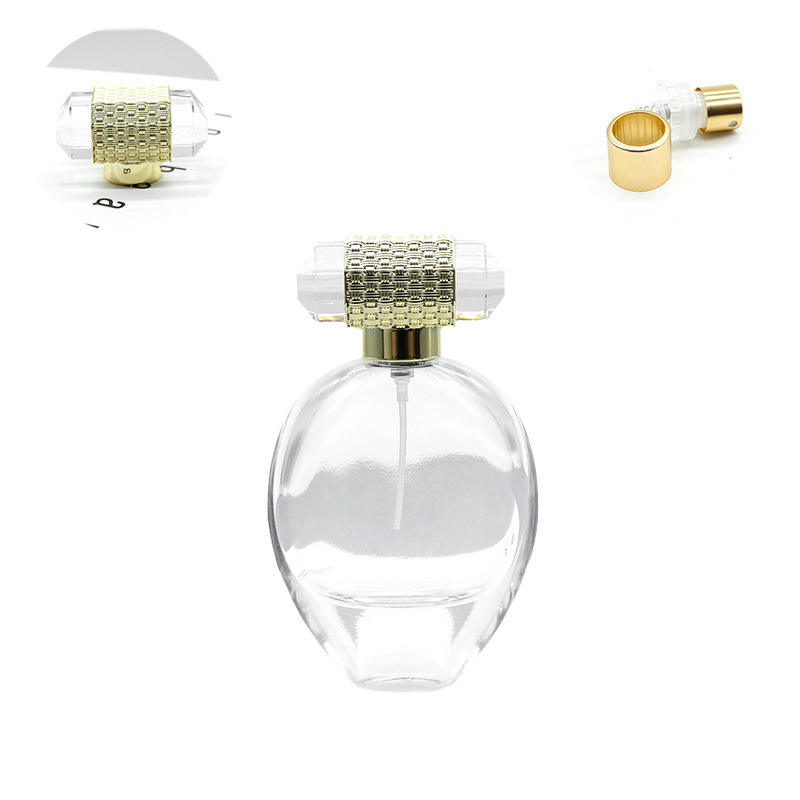 Vente en gros de flacons de parfum et de recharge ovales en verre de 75 ml avec bouchons à clipser, contenants cosmétiques vides, matériau du col en PP, minimum. Commandez 100 pièces