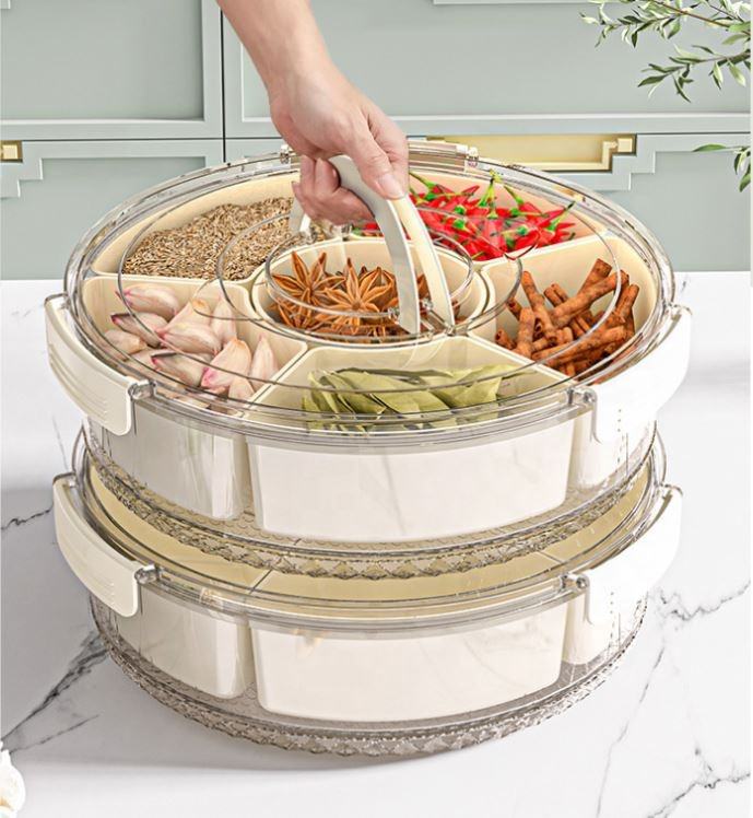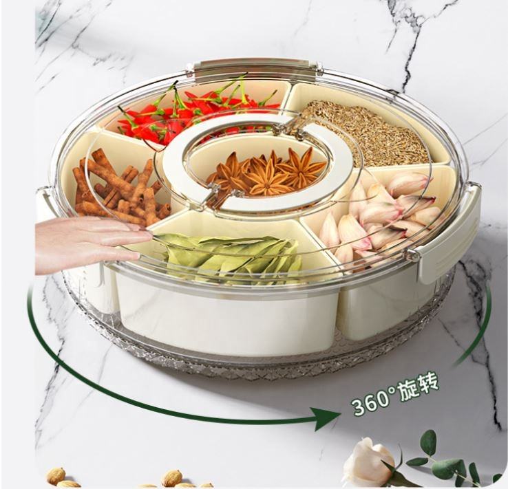 Plateau de rangement rotatif transparent en PP pour épices, fruits secs et snacks, hermétique, 6 compartiments, portable, pour cuisine et salon, idéal pour réfrigérateur - Vente en gros