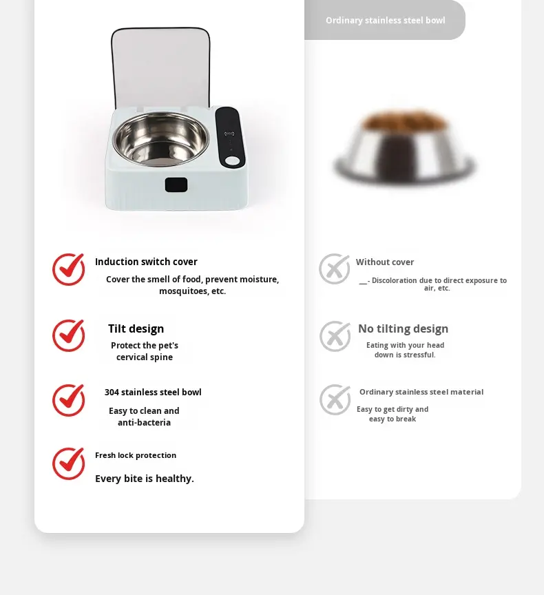 Dispositif:Automatique, Écologique, Facile à nettoyer, Matériel de qualité alimentaire, Élevée, Bol amovible, induction open lid, neck protection, anti-dust, insect protection