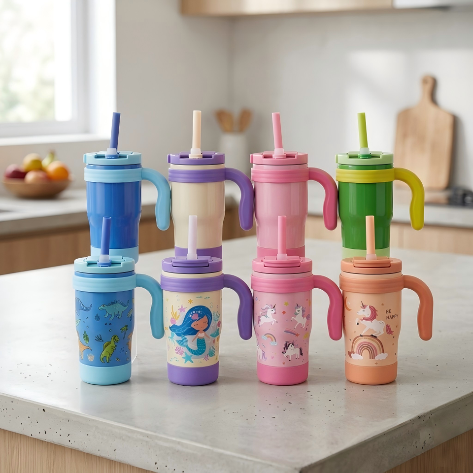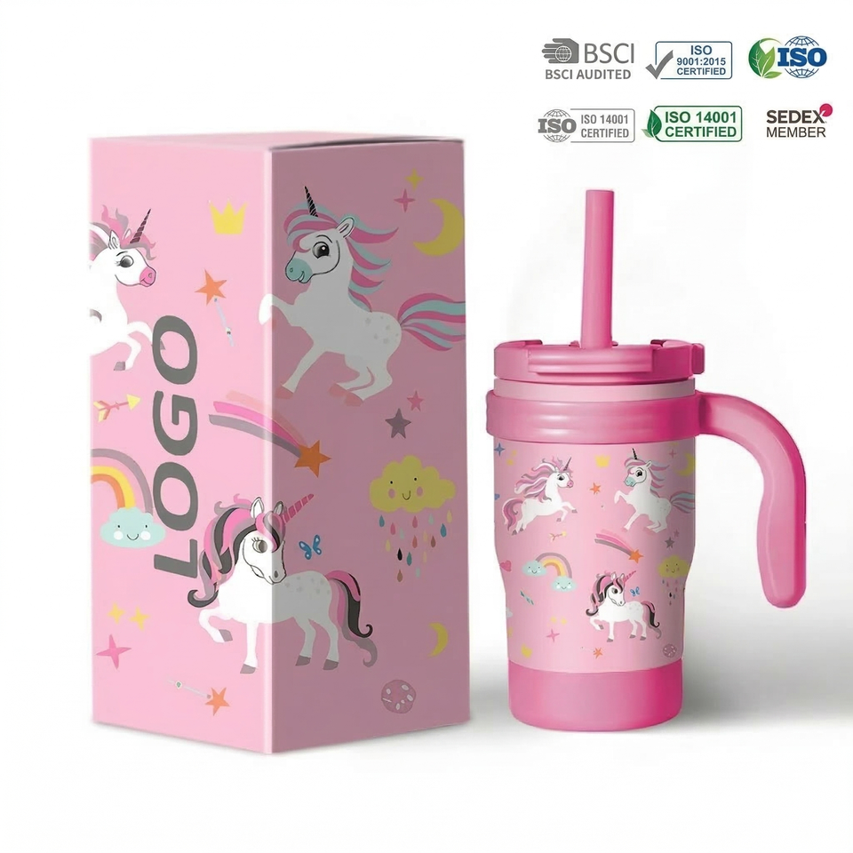Gobelet isotherme personnalisé Houroffer avec logo licorne pour enfants, avec poignée et paille, vente en gros pour cantines scolaires