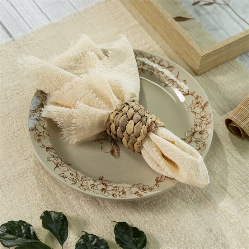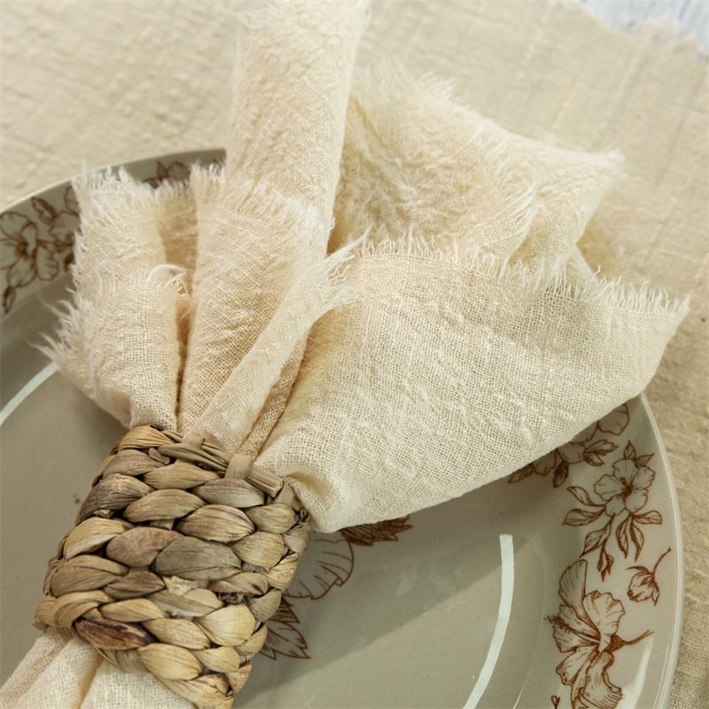 Vente en gros Décoration de table de mariage bohème Carré en polyester texturé bord brut Gaze de coton Étamine Artisanale Serviettes Accessoires