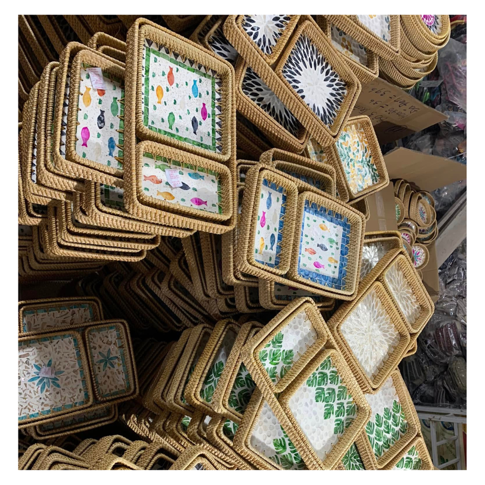 Wholesale Bohemian checkerboard Mother of pearl inlay round rattan coffee tray home decor kitchen decor from Vietnam