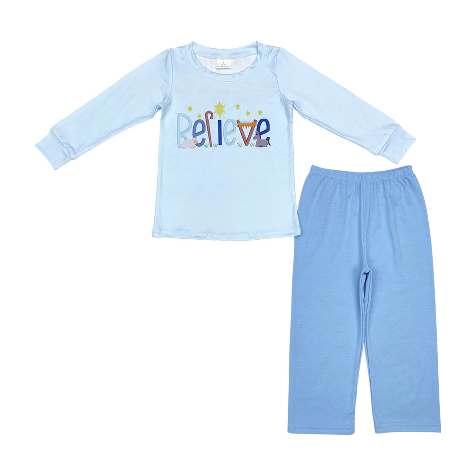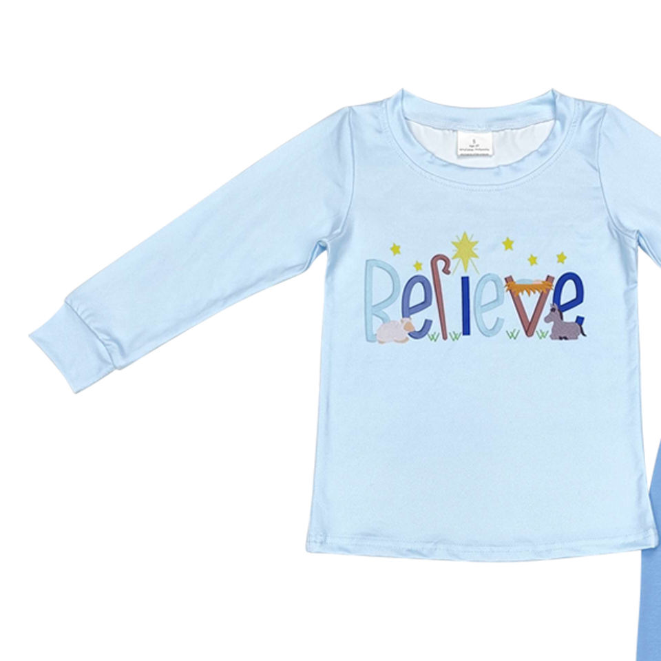 Wholesale Boutique Cute Kids Outfits Little Boy Long Sleeve sets blue Believe Applique Fall Clothing Set for Toddler Boys