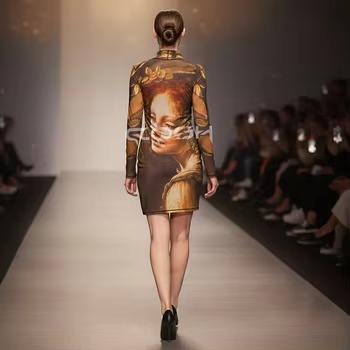 Robe moulante transparente à manches longues en maille, imprimé Muse de la Renaissance, pour femme, vente en gros, personnalisable, mini-robe de club