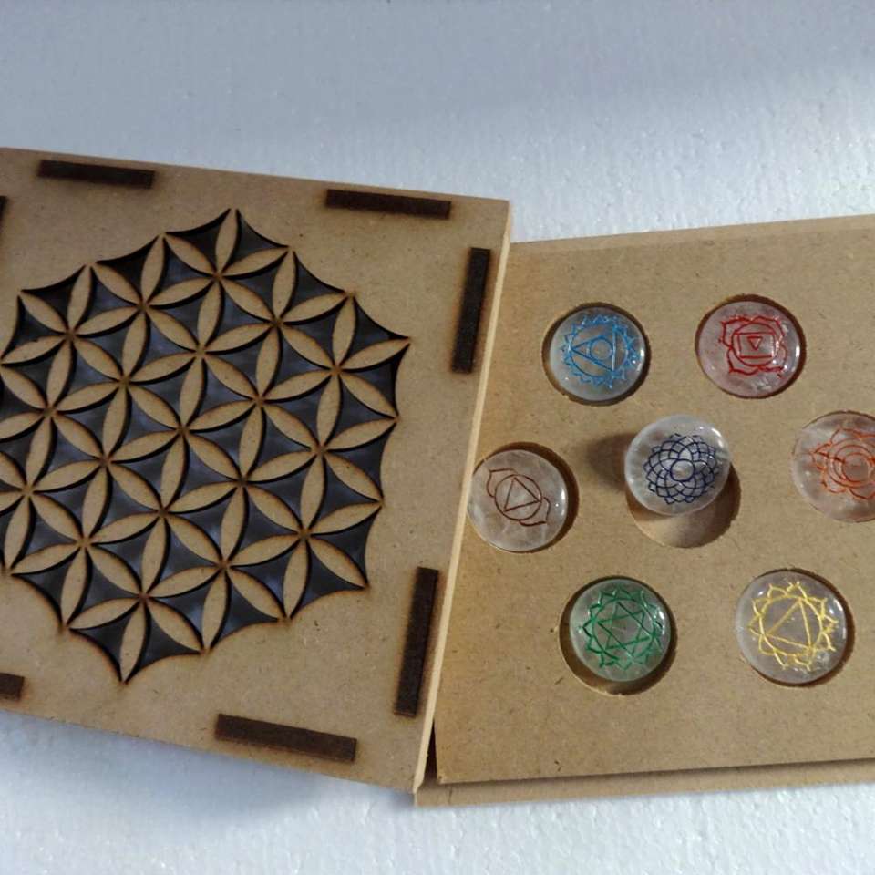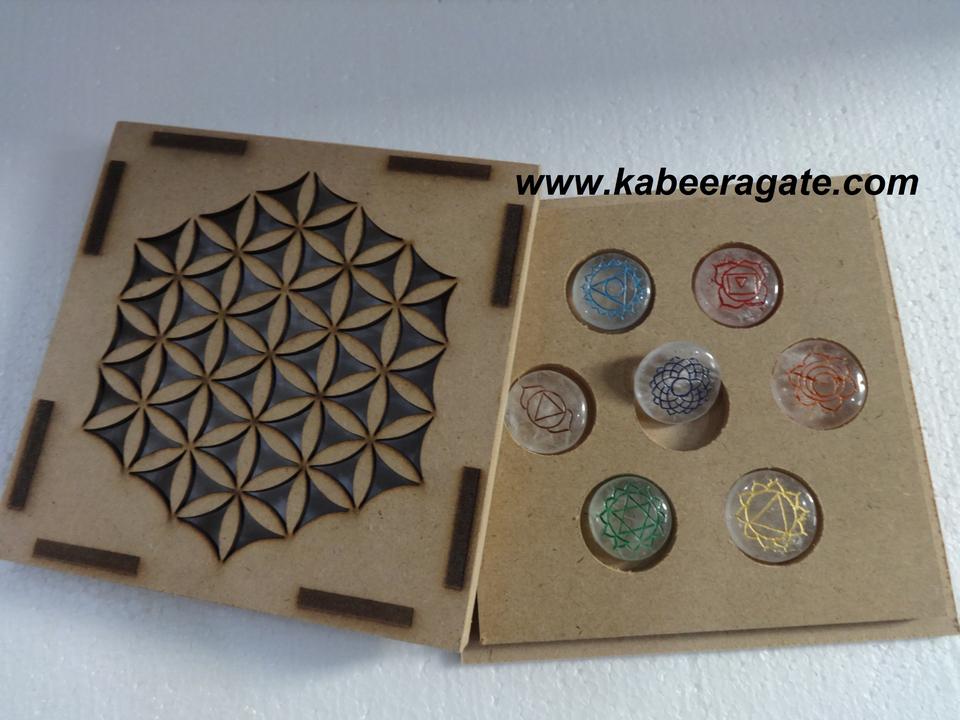 Nom du produit:Chakra en cristal de quartz réglé avec la boîte gravée de symbole