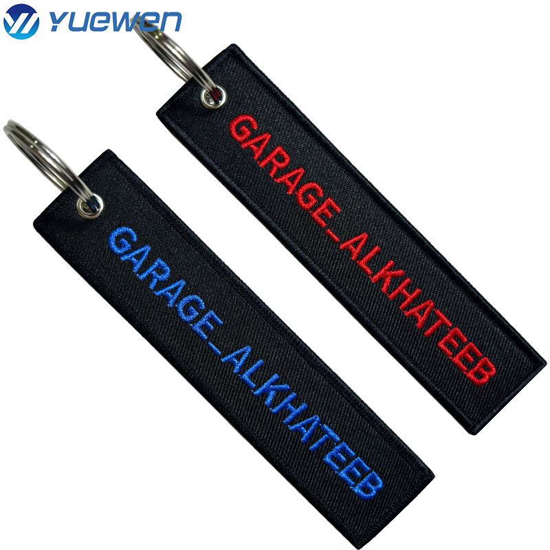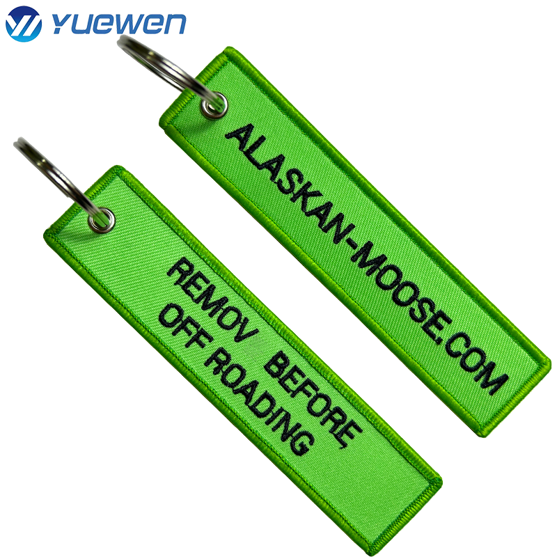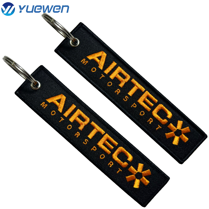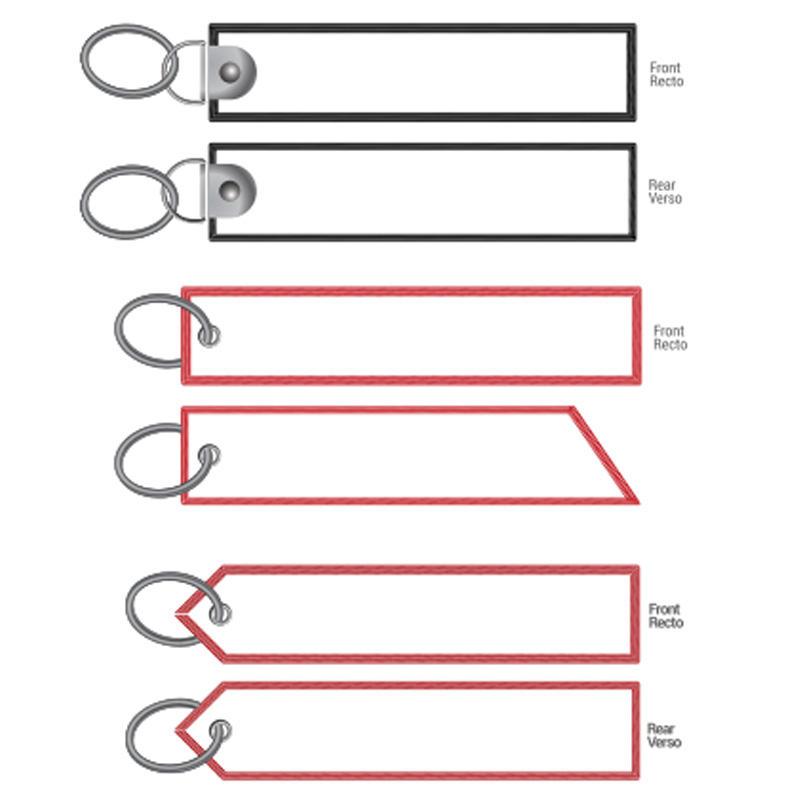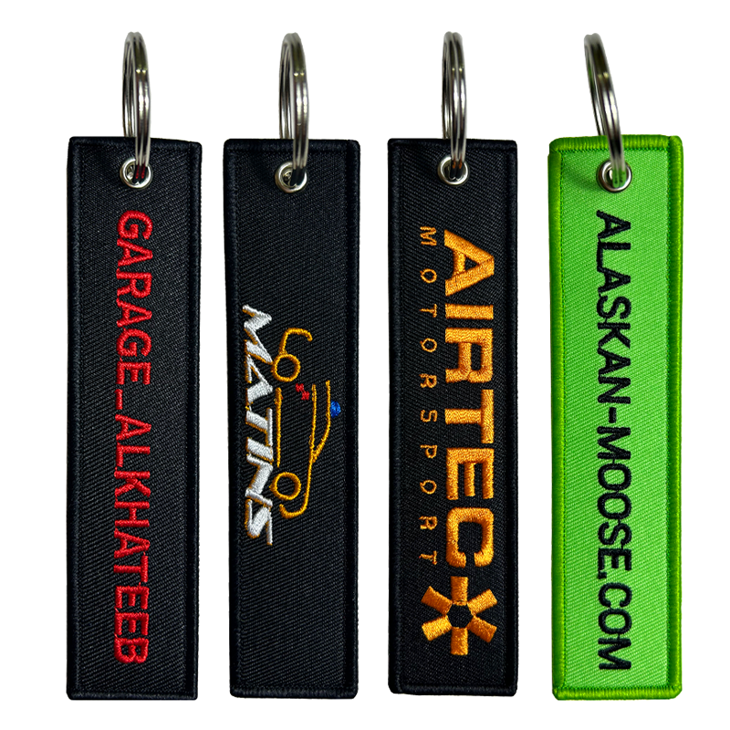Porte‑clés brodé personnalisable en polyester, couleurs Pantone, bords Merrow/découpe/laser, dos: thermoc./velcro/adh./plast./sans