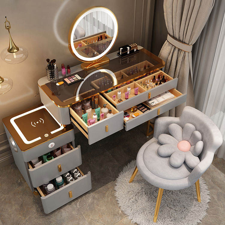Meubles de chambre à coucher en bois massif au design moderne, coiffeuse réglable et escamotable avec tiroirs en miroir LED
