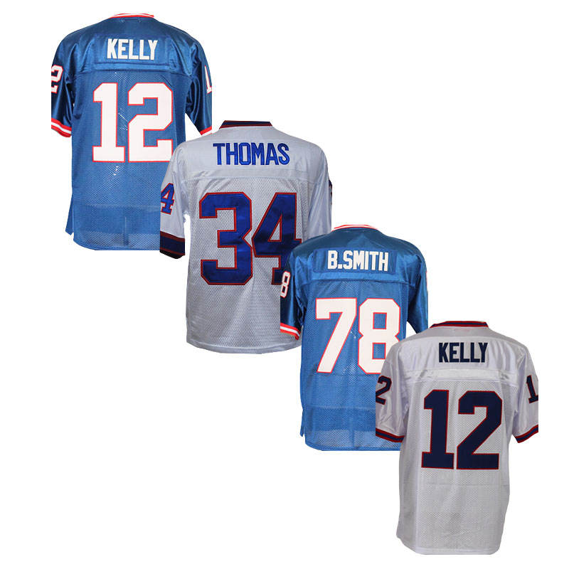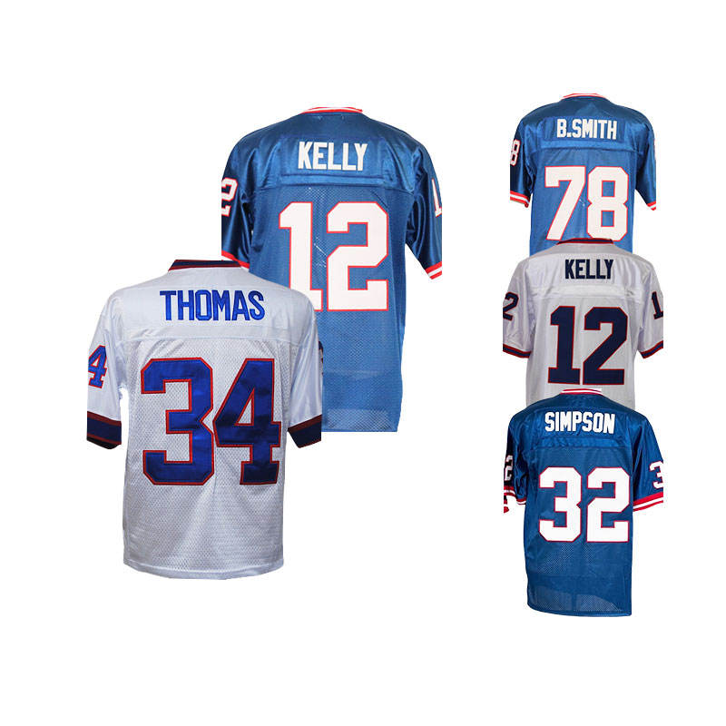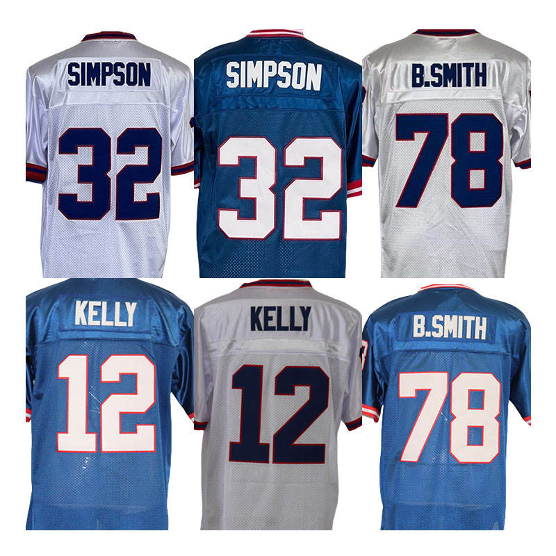 Maillot de football américain rétro cousu en gros à prix réduit 32 OJ Simpson 12 Jim Kelly 78 Bruce Smith