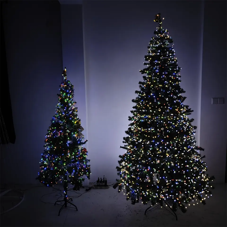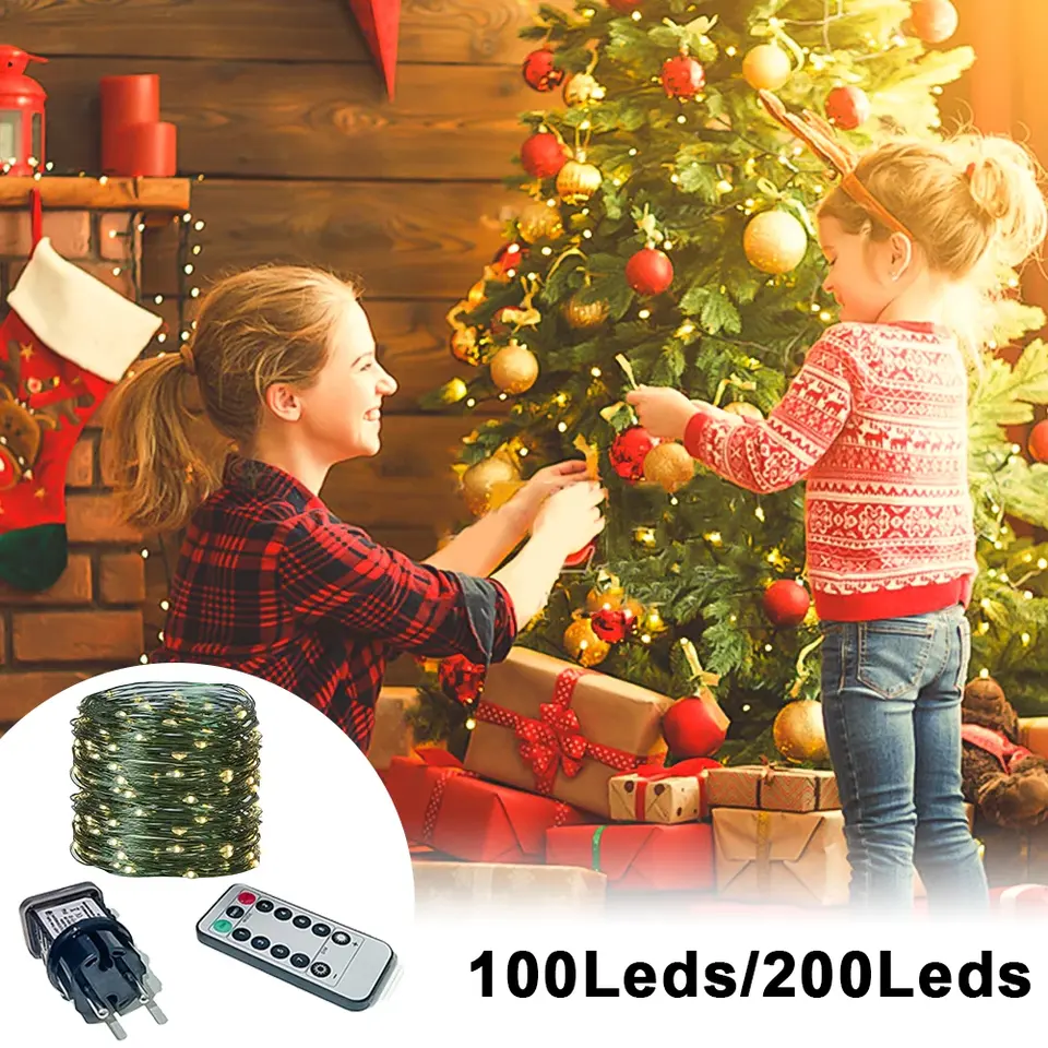 Guirlande lumineuse LED de Noël en gros, fil de cuivre vert, guirlande féerique, télécommande manuelle, piles, étanche IP43, lumière chaude