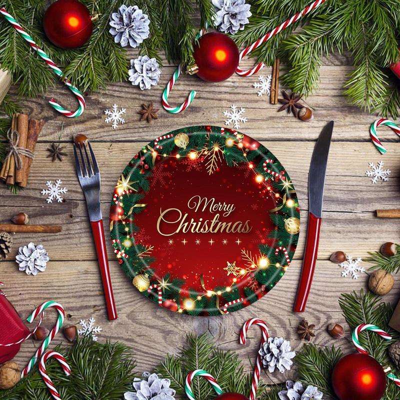Lots de Vaisselle Jetable pour Fêtes de Noël en Gros – Décorations Rouges et Vertes avec Motifs Arbre et Cadeaux – Assiettes en Carton, Serviettes en Papier, Nappe LM