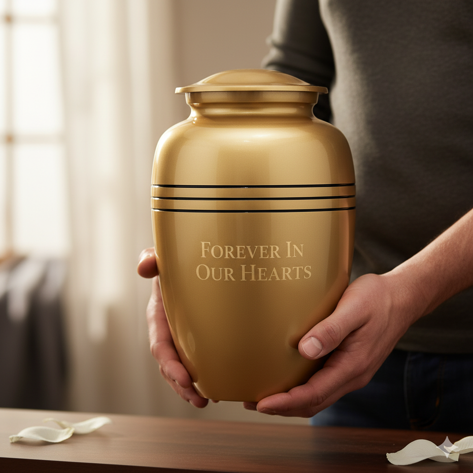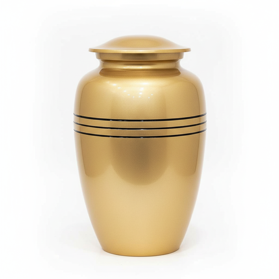 Urne funéraire en laiton doré de conception classique pour cendres humaines adultes, vente en gros | Bandes noires en métal pour articles funéraires | Collections Maaz