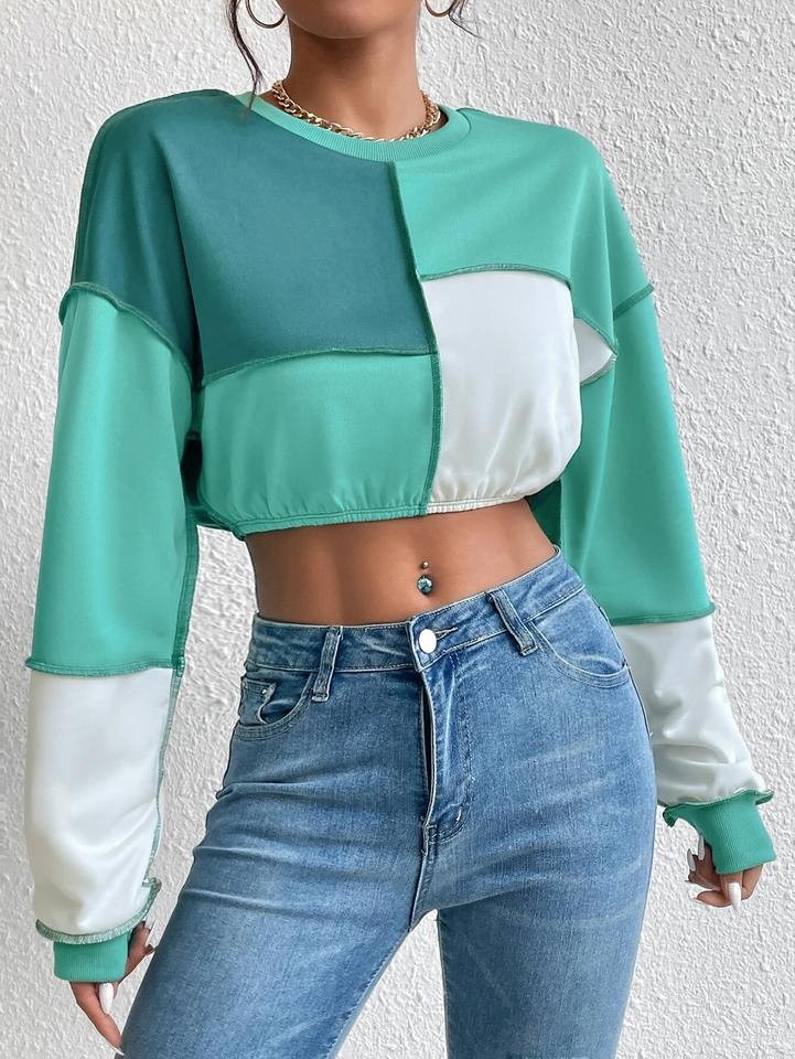 Sweat-shirt court à blocs de couleur en gros pour femmes, haut décontracté à manches longues et col rond