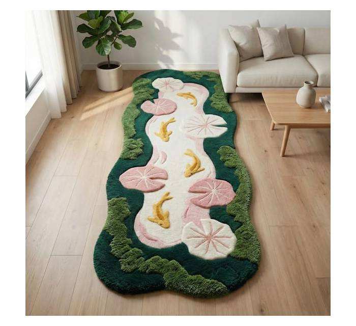 Tapis de sol de salon personnalisé en gros, tufté 3D, forme de bassin irrégulière, inspiré de la nature, motif fleur de lotus vert mousse