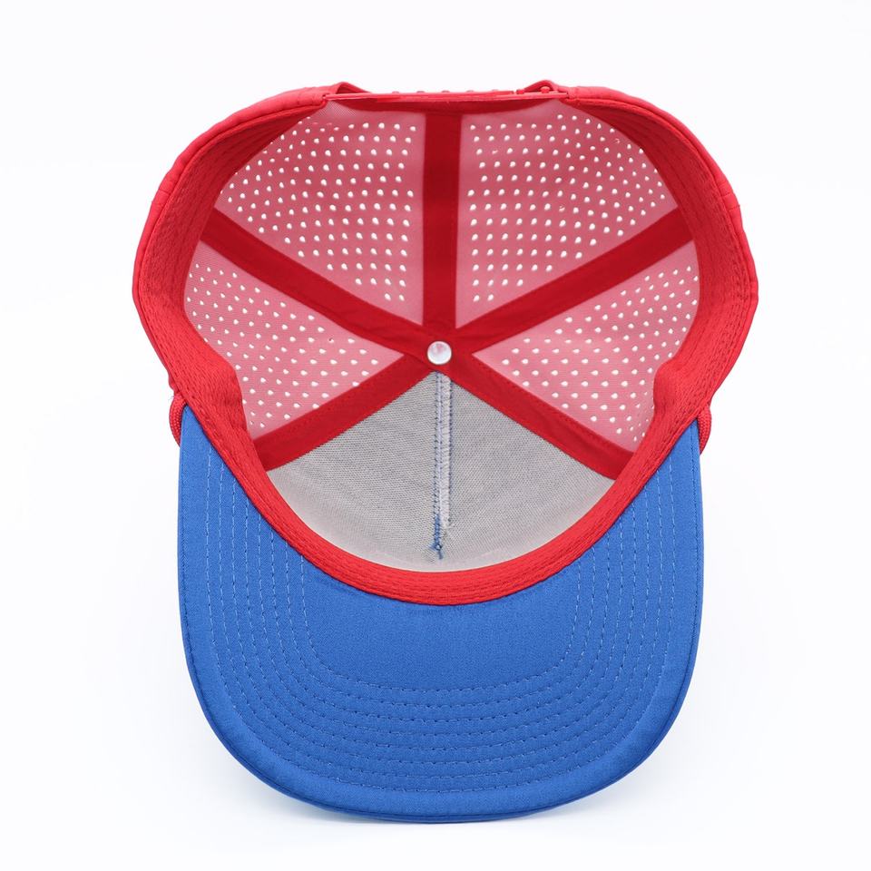 Casquette 5 panneaux personnalisée en gros, 100% polyester respirant et imperméable, avec motif chevrons et trous découpés au laser, logo en caoutchouc PVC haute performance