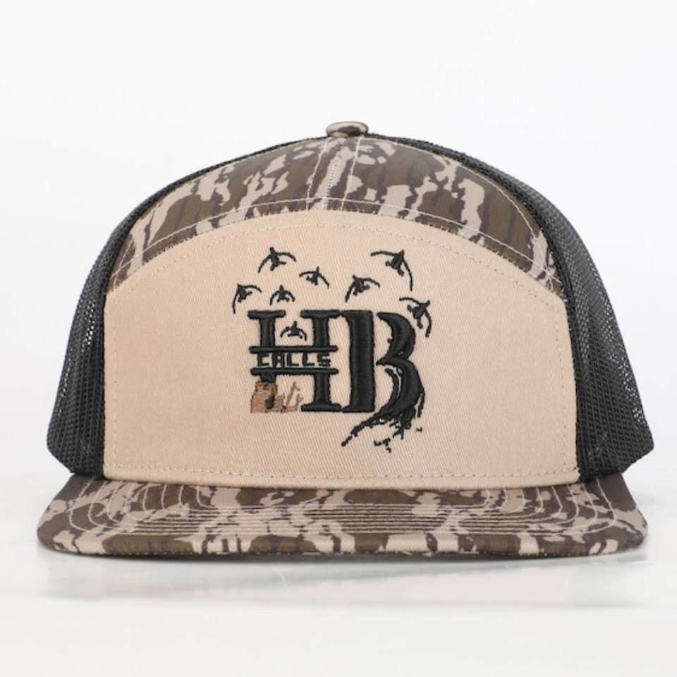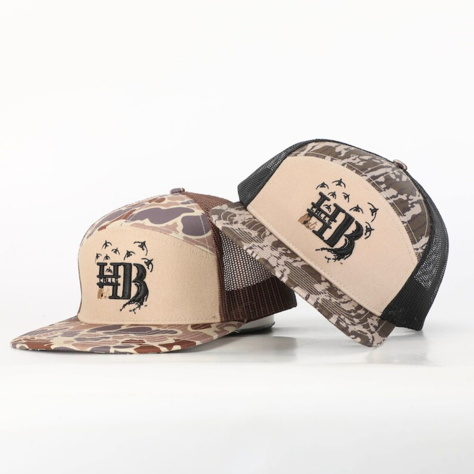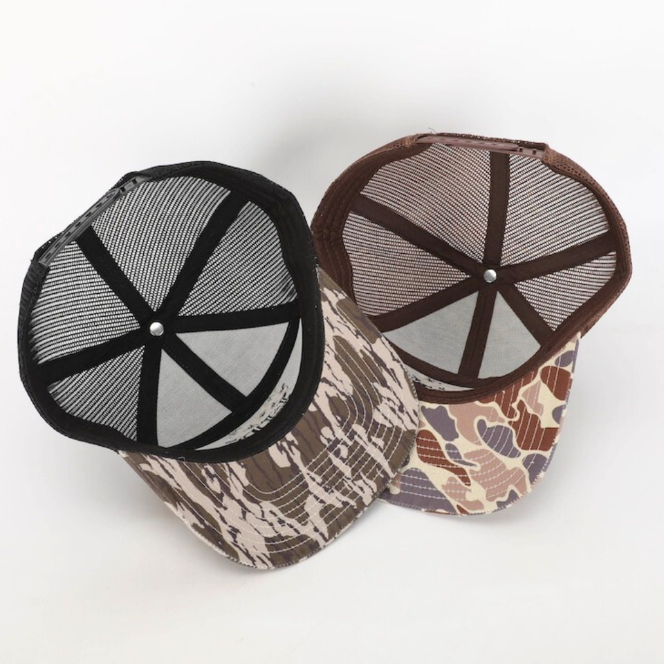 Vente en gros de chapeau de camouflage HB en coton à 7 panneaux personnalisé Snapback structuré Camo Hunting Mesh Trucker Outdoor Custom Embroidery Logo
