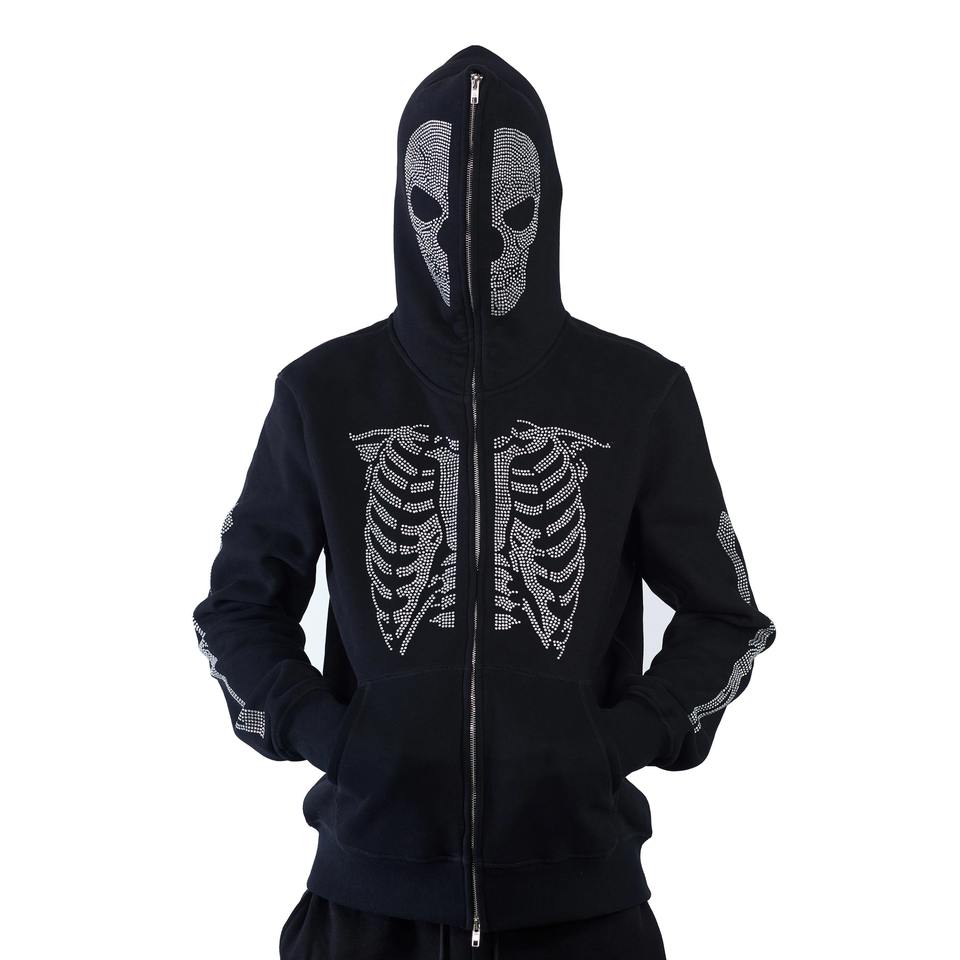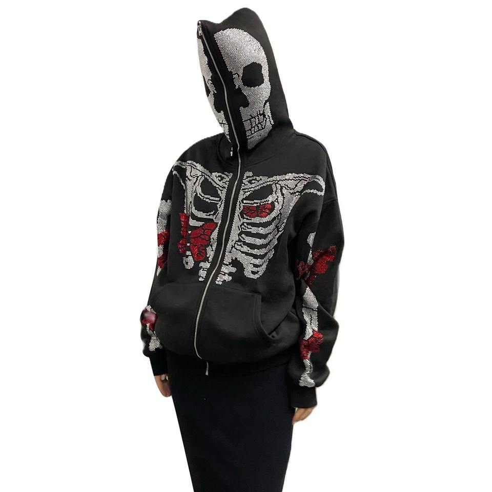 Vente en gros de sweats à capuche surdimensionnés personnalisés, brodés, unis, avec strass, motif squelette crâne, pour l'hiver
