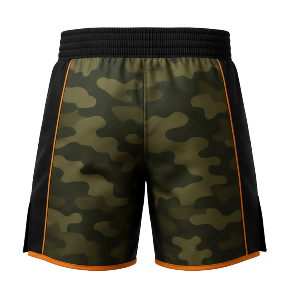 Shorts de MMA et de boxe personnalisés en camouflage en gros | Shorts de combat camouflage avec bordure orange