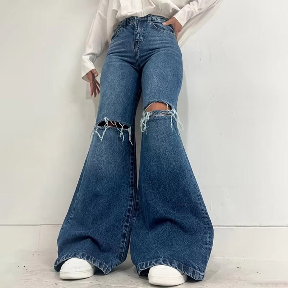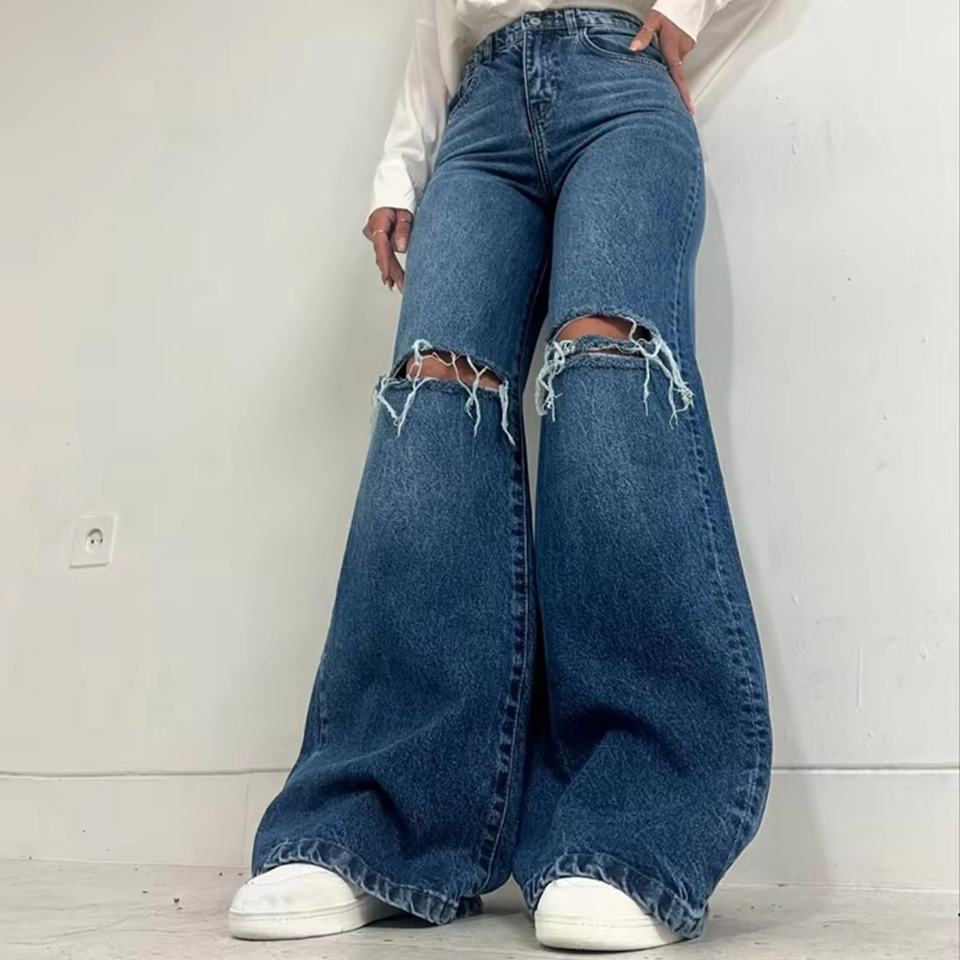 Vente en gros de jeans en coton personnalisés déchirés, pantalons en denim à jambes larges, pantalons évasés, pantalons baggy pour femmes