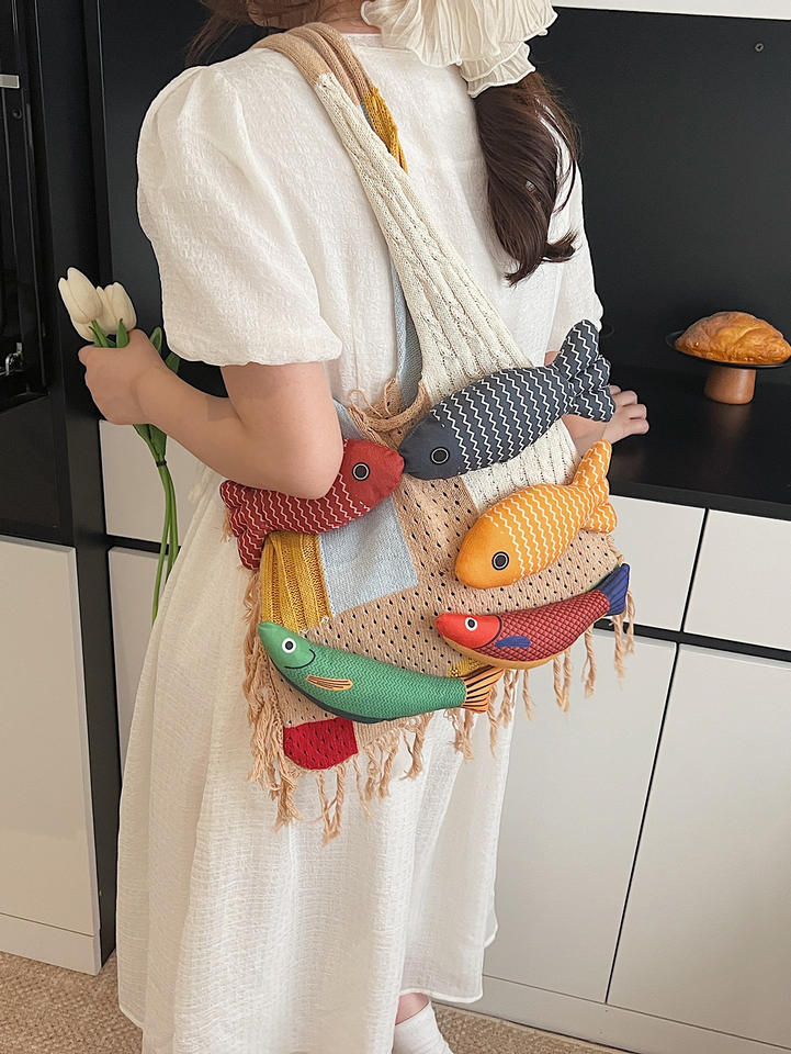 Sac fourre-tout tissé à bandoulière pour femmes, grande capacité, style rétro, avec pompons, personnalisable, vente en gros